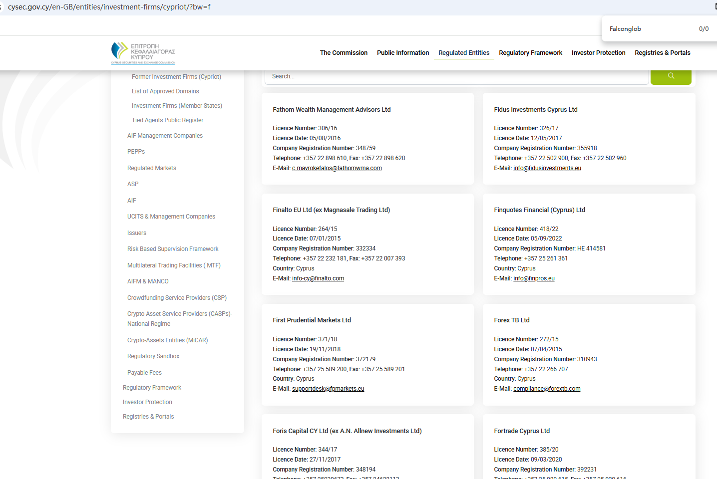 According to its website, it is regulated by both the Financial Conduct Authority (FCA) and the Cyprus Securities and Exchange Commission (CySEC). However, a search revealed no matching information with CySEC. Furthermore, the FCA issued a warning regarding Falconglob, suspecting that this company may be offering financial services or products without the necessary authorization.