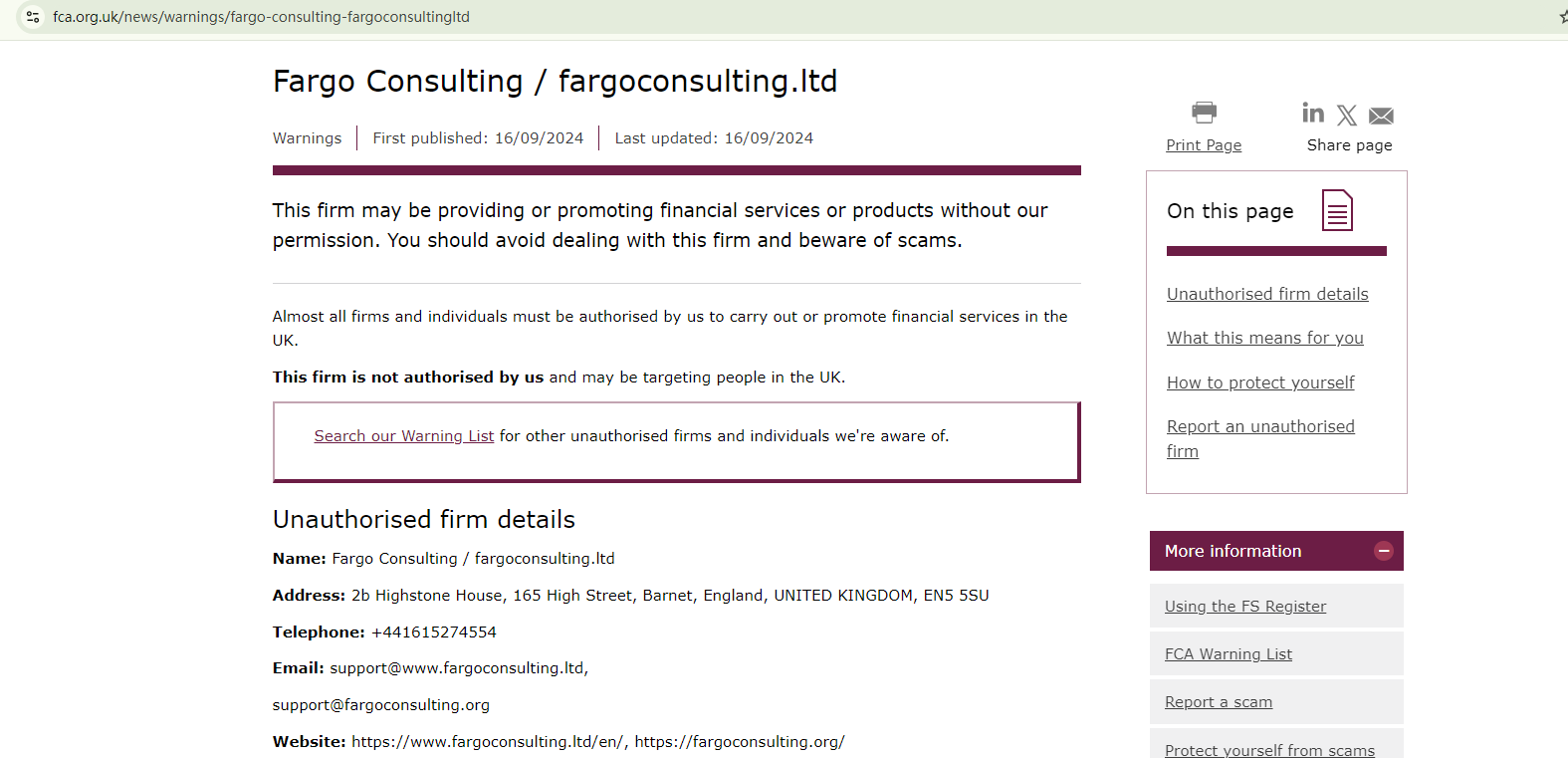 Furthermore, while Fargo Consulting is allegedly located in the UK, it has been warned by the Financial Conduct Authority (FCA) for the lack of the required authorization.
