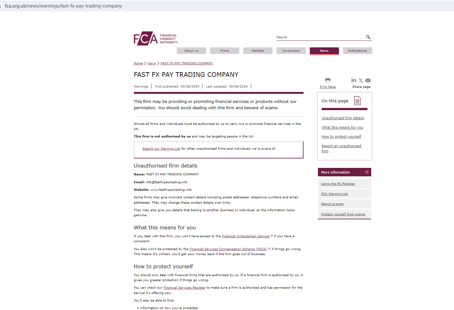 In addition, the Financial Conduct Authority (FCA) issued a warning against FAST FX PAY TRADING COMPANY, believing this company might be providing financial services or products without proper authorization in the UK.