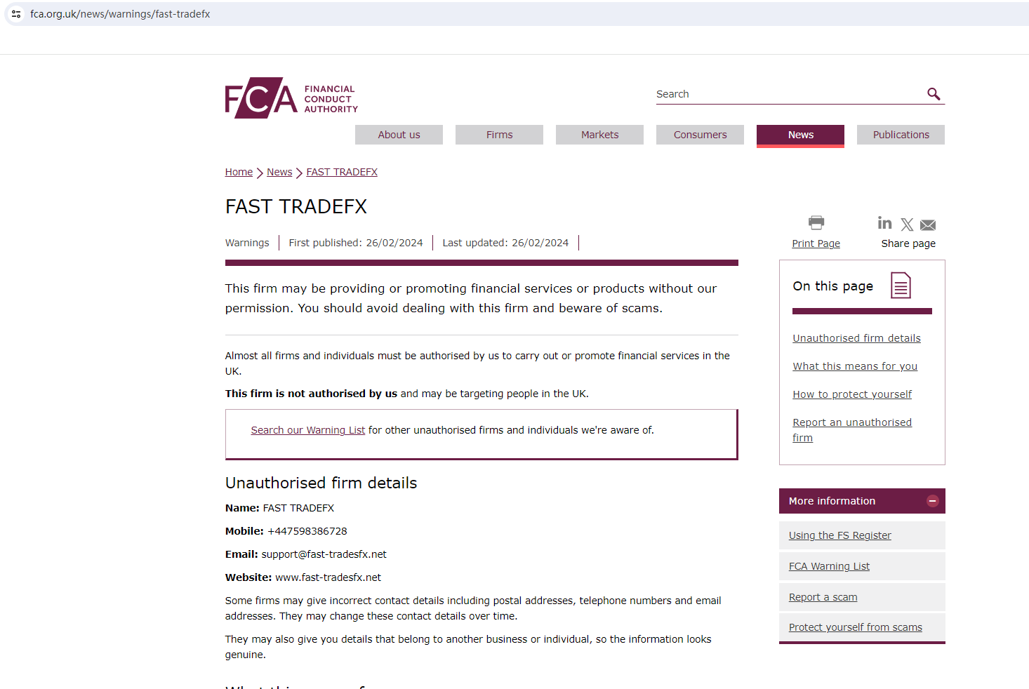 In addition, the United Kingdom Financial Conduct Authority (UK FCA) issued a warning that FAST TRADESFX was providing financial services or products in the UK without authorisation.