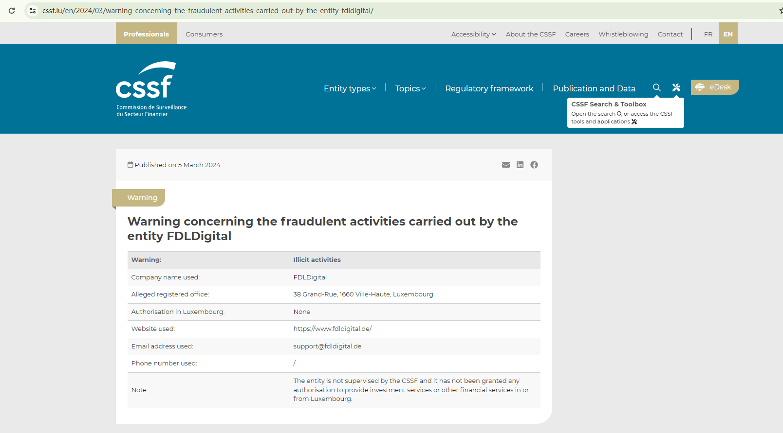 Despite FDLDigital's claims of having an office in Luxembourg and being headquartered in the UK, there is no evidence to suggest that it is regulated in either of these countries. Adding to the concern, the Commission de Surveillance du Secteur Financier (CSSF) has issued a warning about fraudulent activities associated with FDLDigital. This information further underscores the need for caution when dealing with this entity.