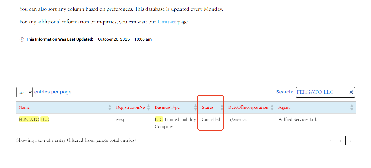 According to our previous investigation, Fergatex claimed to be only registered with the Saint Vincent FSA and never held any valid license from a recognized financial regulatory authority, meaning its financial activities were unregulated and carried a high risk of fraud. Furthermore, its registration status in Saint Vincent is now shown as "cancelled," indicating that the entity has ceased operations.