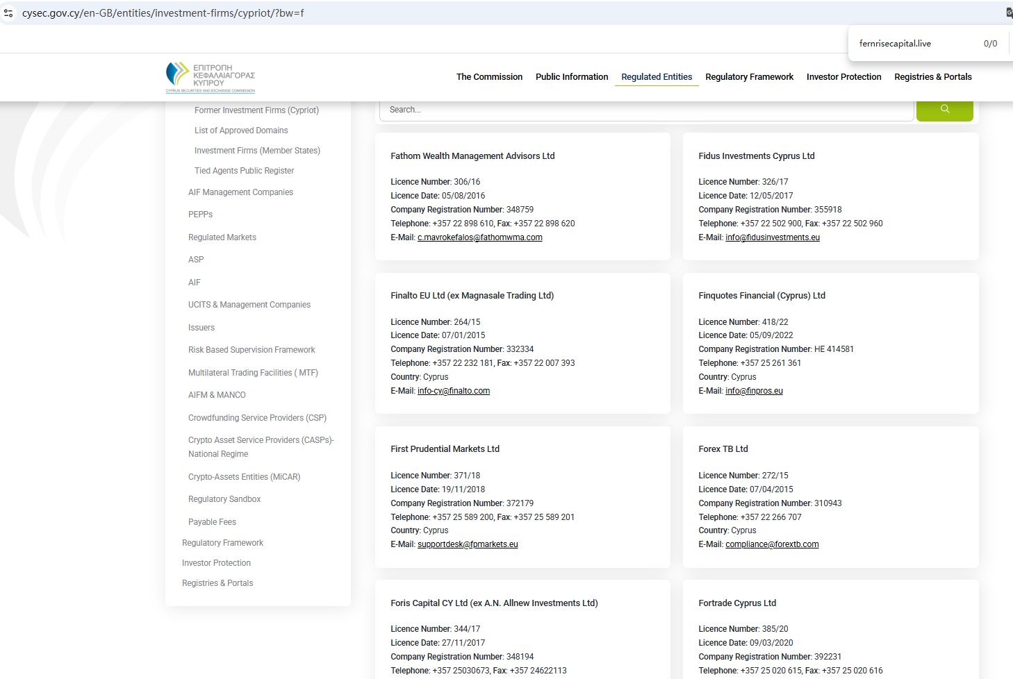According to its website, it is regulated by both the Financial Conduct Authority (FCA) and the Cyprus Securities and Exchange Commission (CySEC). However, a search revealed no matching information with CySEC. Furthermore, the FCA issued a warning regarding fernrisecapital.live, suspecting that this company may be offering financial services or products without the necessary authorization.