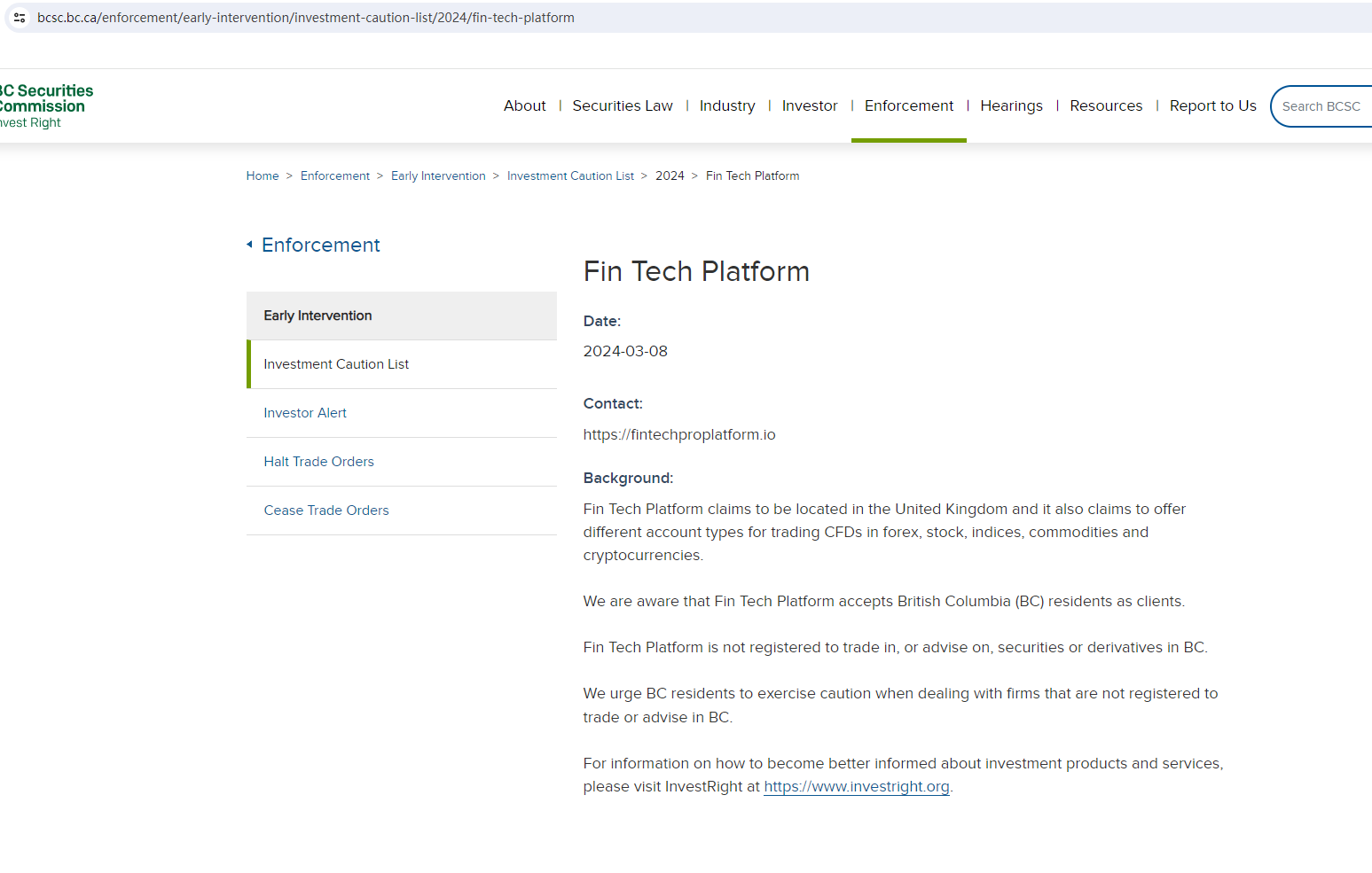 Additionally, the Ontario Securities Commission (OSC) has issued a warning, saying that Fin Tech Platform, found at www.fintechplatform.pro, is not registered in Ontario to engage in the business of trading in securities.