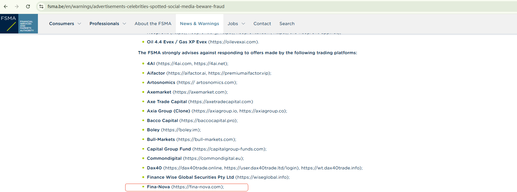 Fina Nova attempts to establish a reliable and reputable image through exaggerated language. However, these claims are largely baseless. The lack of useful company information and valid licensing details makes its credibility questionable. The Belgian Financial Services and Markets Authority (FSMA) has added Fina Nova to its warning list as a fraudulent trading platform operating in the Belgian market and advised investors to stay away from it.