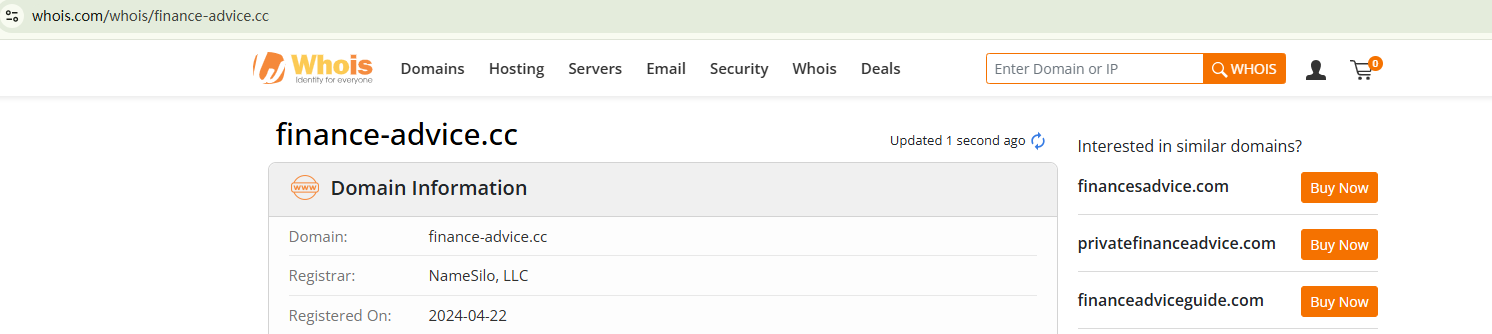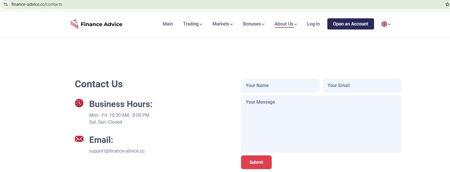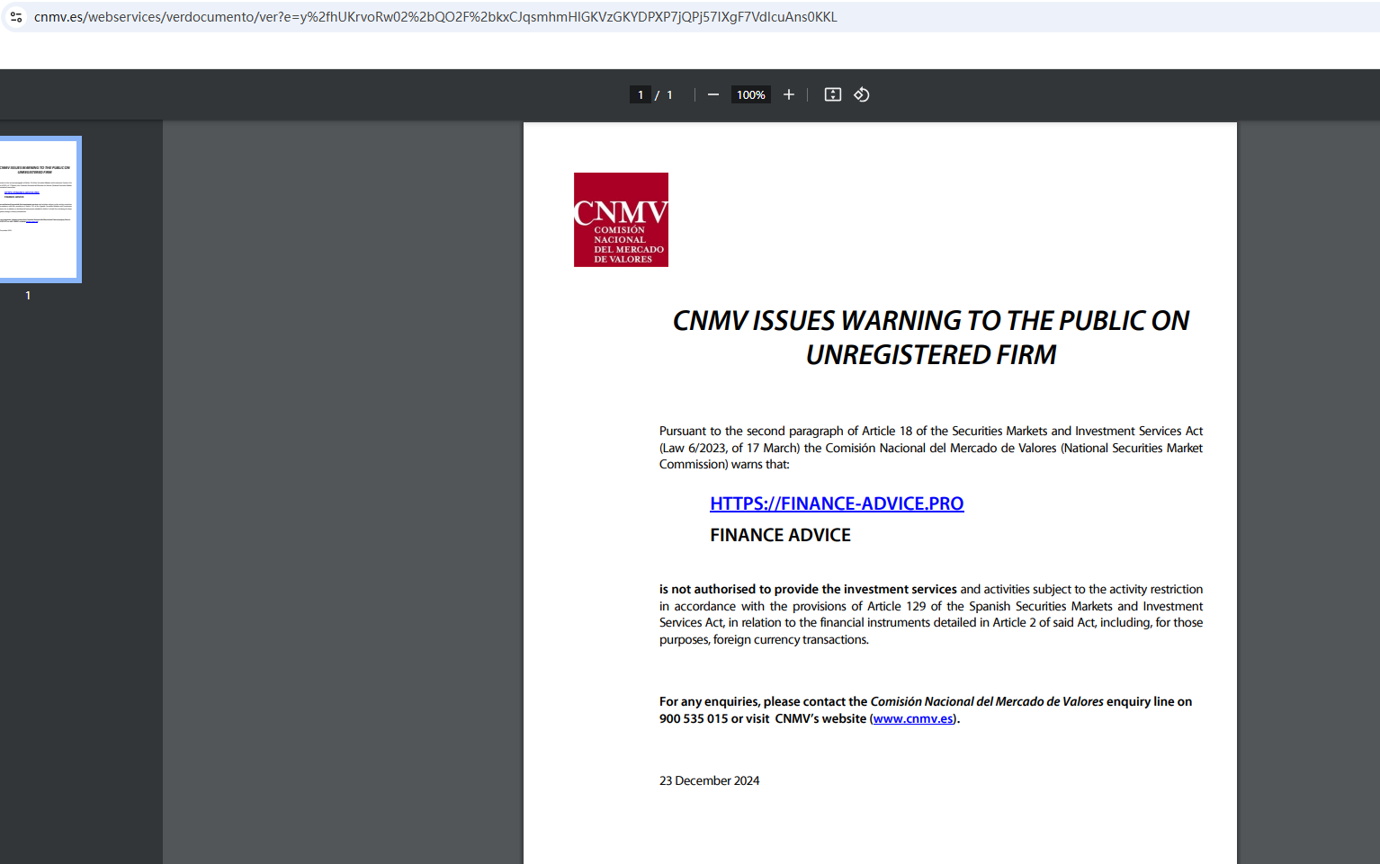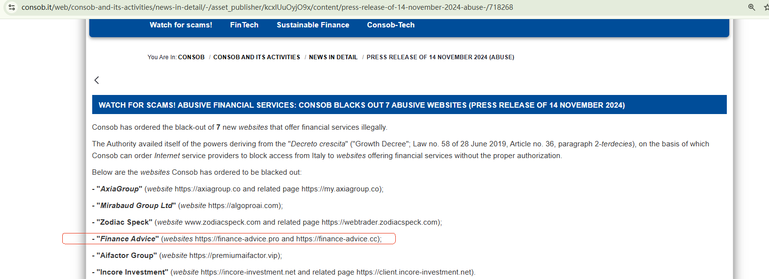 Finance Advice provides financial services through two websites: finance-advice.cc and finance-advice.pro. Both of them were registered less than one year ago. The unknown operators of the brand simply rely on bogus promotions to establish its seemingly reputable image, keeping investors in the dark about their true company information. There is also no licensing information provided. This lack of transparency sounds alarms. In addition, the Italian Companies and Exchange Commission (CONSOB) ordered Finance Advice's website to be blacked out since it offers financial services illegally in Italy.In essence, Finance Advice is not regulated by any governing body. Entrusting it with investors' funds is highly risky, as there are no legal protections in place to safeguard the funds.Finance Advice appears to be a scam.