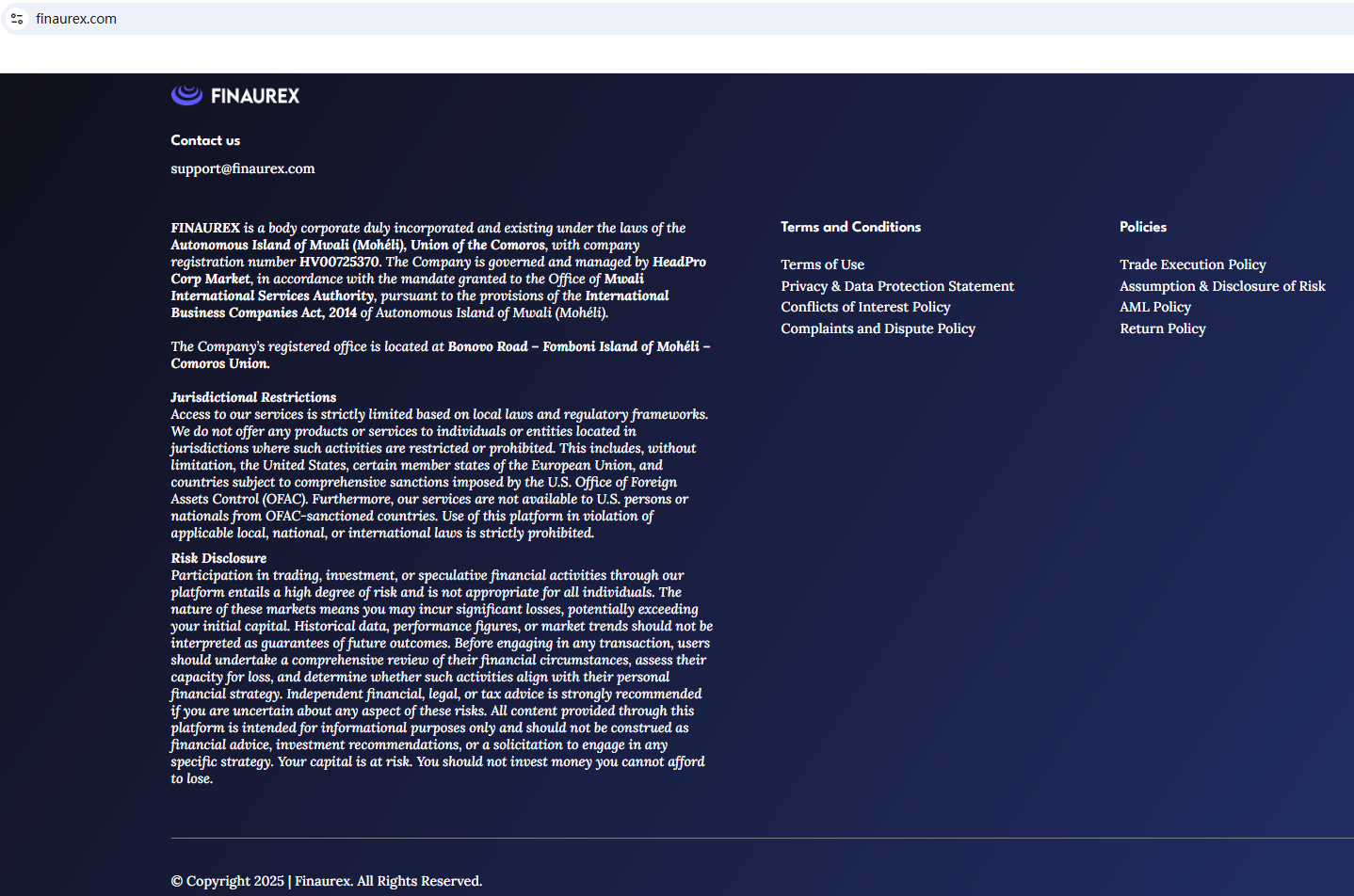 FINAUREX claims to be regulated by the Mwali International Services Authority (MISA) in Comoros. However, the MISA is an offshore regulatory body that is known for its weak oversight and lack of international recognition. The jurisdiction offers limited investor protection, and its regulatory framework is generally considered to be unreliable by global financial standards.