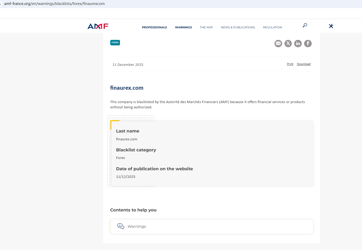 On Dec 11, 2025, the Financial Authority (Autorité des Marchés Financiers, AMF) added FINAUREX to warning list for it being an unauthorized company engaging in forex activities. https://www.amf-france.org/en/warnings/blacklists/forex/finaurexcom