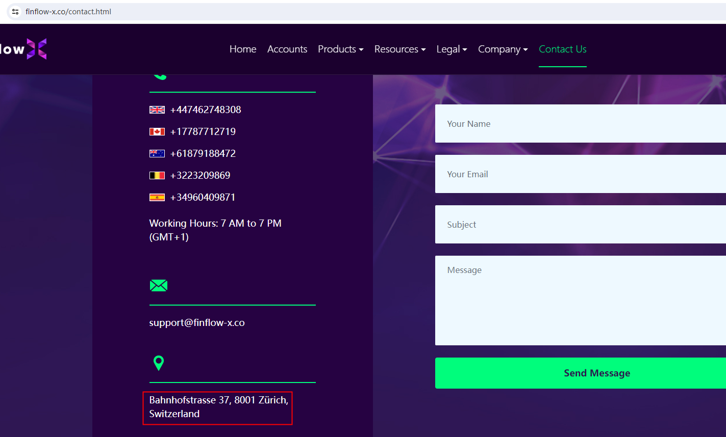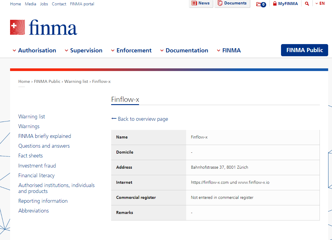 Finflow x provides an address in the Switzerland, but fails to seek authorization from the Swiss Financial Market Supervisory Authority (FINMA), as stated in the warning issued by the FINMA. The Swiss financial watchdog has added this company to its warning list for not in its commercial register.
