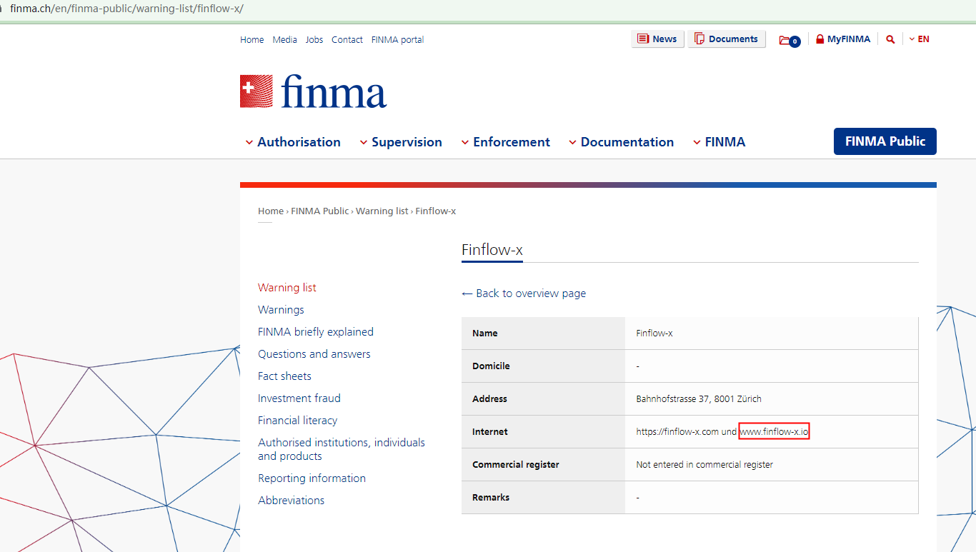 On October 4, 2023, the Swiss Financial Market Supervisory Authority (FINMA) exposed a new website address of Finflow x: www.finflow-x.io.