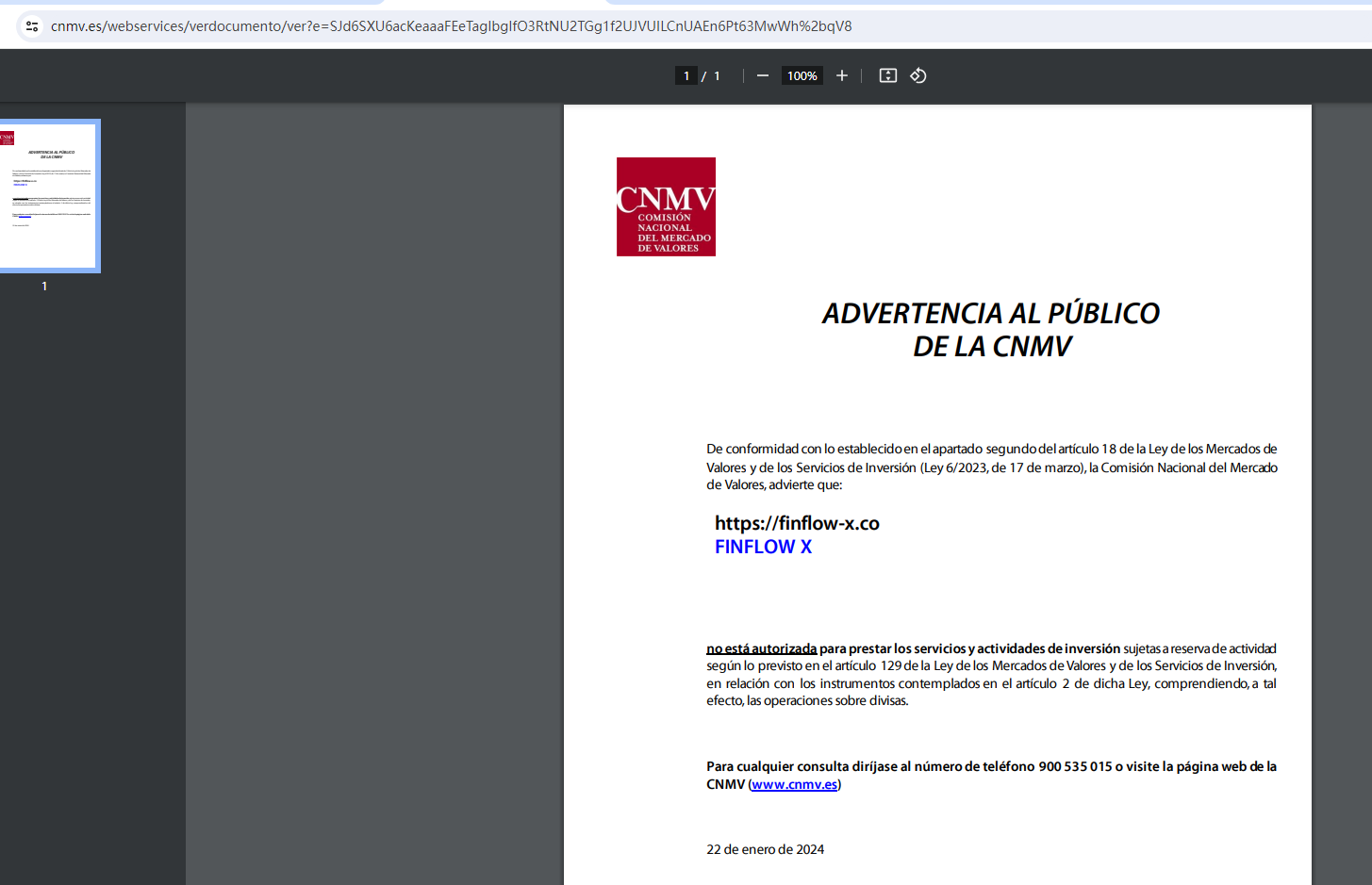 As Finflow x continues its fraudulent activities, the Comisión Nacional del Mercado de Valores (CNMV), on 22 January 2024, spotted a new website address "https://finflow-x.co/" created by the broker. Therefore, this Spain's financial watchdog updated its warning against Finflow x to caution about the risks involved.