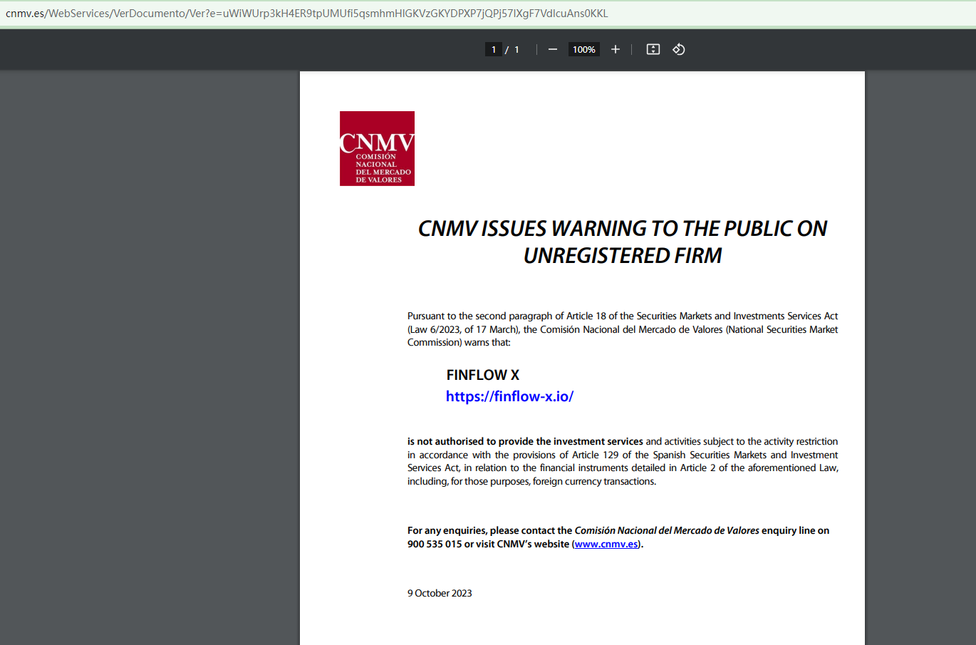 On September 18, 2023, the Comisión Nacional del Mercado de Valores (CNMV) added Finflow x to its warning list for providing investment services without authorization. https://www.cnmv.es/Portal/ResultadoBusqueda.aspx?tipo=1&sortExpression=Fecha&sortDirection=1&page=0