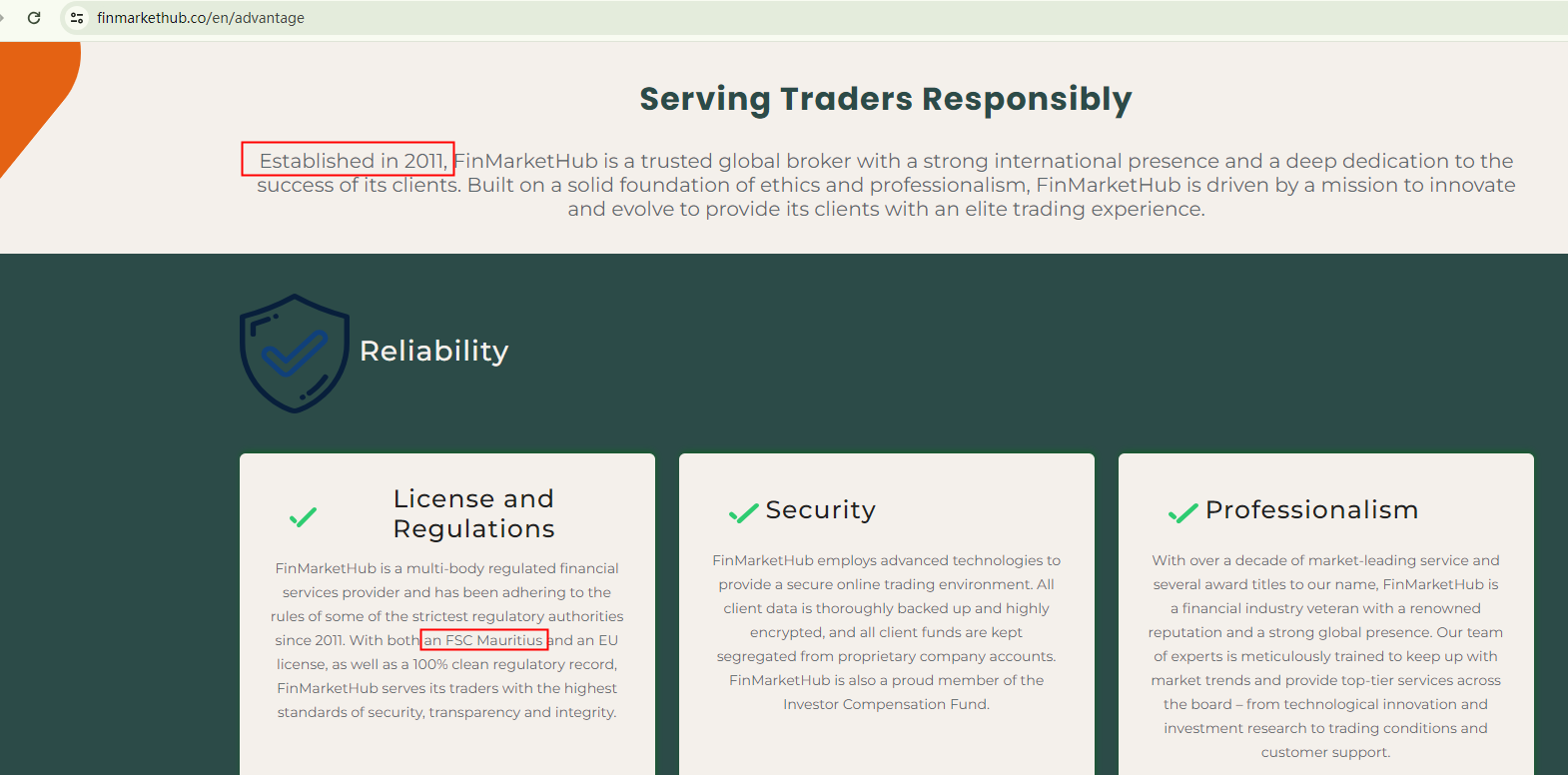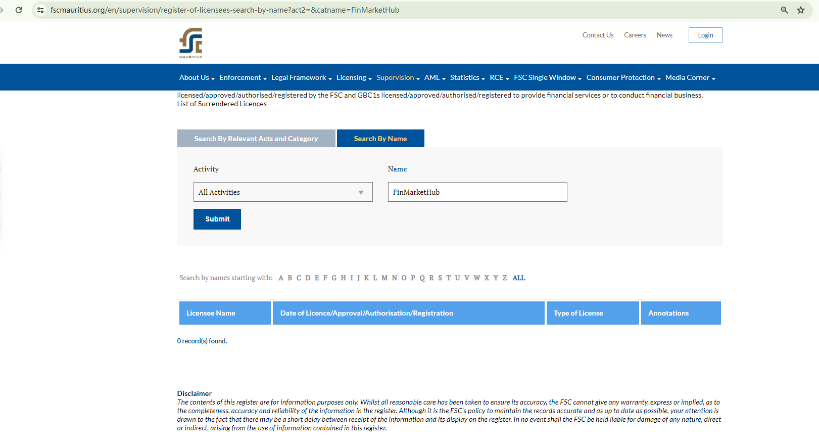 FinMarketHub purports to hold a license from the Mauritius Financial Services Commission (Mauritius FSC). However, this claim lacks credibility as there are no corresponding records in the Mauritius FSC register. Furthermore, it ambiguously states that it possesses an EU license, but fails to specify the exact financial regulator under which it falls.