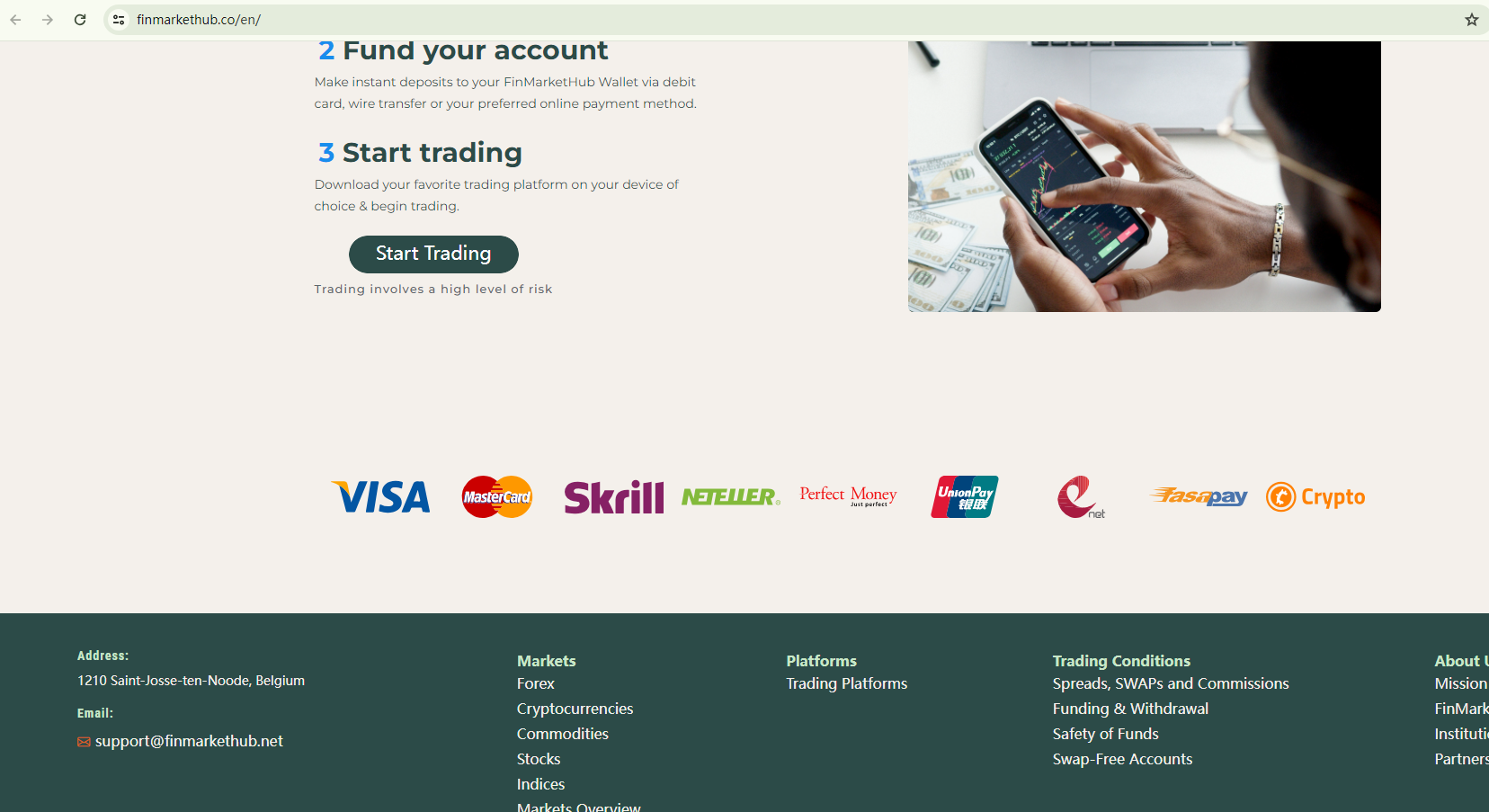 FinMarketHub purports to hold a license from the Mauritius Financial Services Commission (Mauritius FSC). However, this claim lacks credibility as there are no corresponding records in the Mauritius FSC register. Furthermore, it ambiguously states that it possesses an EU license, but fails to specify the exact financial regulator under which it falls.Upon examining its website, it becomes apparent that the broker alleges to be based in Belgium. This is a country that has unequivocally outlawed all leverage OTC derivatives, all binary options, and the sales methods by which they are distributed, due to their high-risk nature. Consequently, any brokers operating in this country are indisputably illegal.Adding to the concerns, the Federal Financial Supervisory Authority (BaFin) has issued a warning to consumers regarding the services offered on the website finmarkethub.co. It states that the operator is offering financial and investment services on this website without the necessary authorisation.In summary, FinMarketHub is not regulated by any authoritative body. Entrusting it with investors' funds poses a significant risk, as there are no legal protections in place to safeguard these funds. Therefore, it appears that FinMarketHub may be a scam.