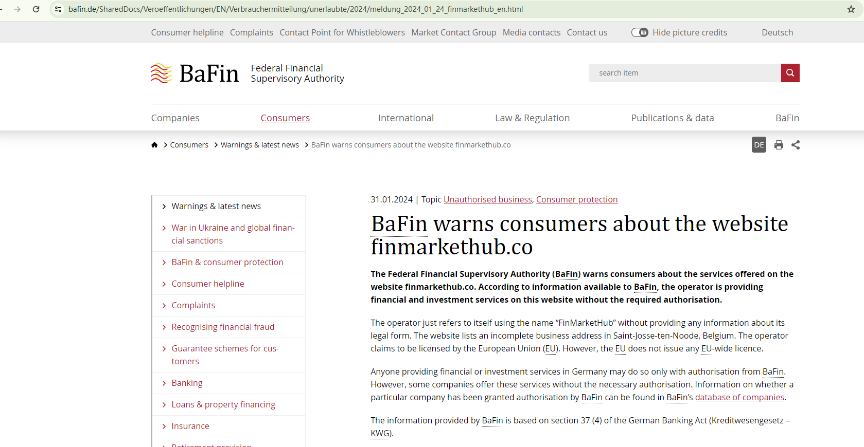 Adding to the concerns, the Federal Financial Supervisory Authority (BaFin) has issued a warning to consumers regarding the services offered on the website finmarkethub.co. It states that the operator is offering financial and investment services on this website without the necessary authorisation.