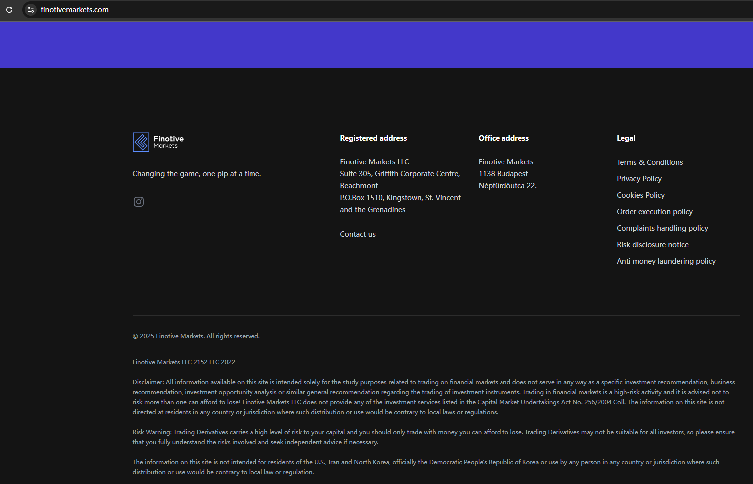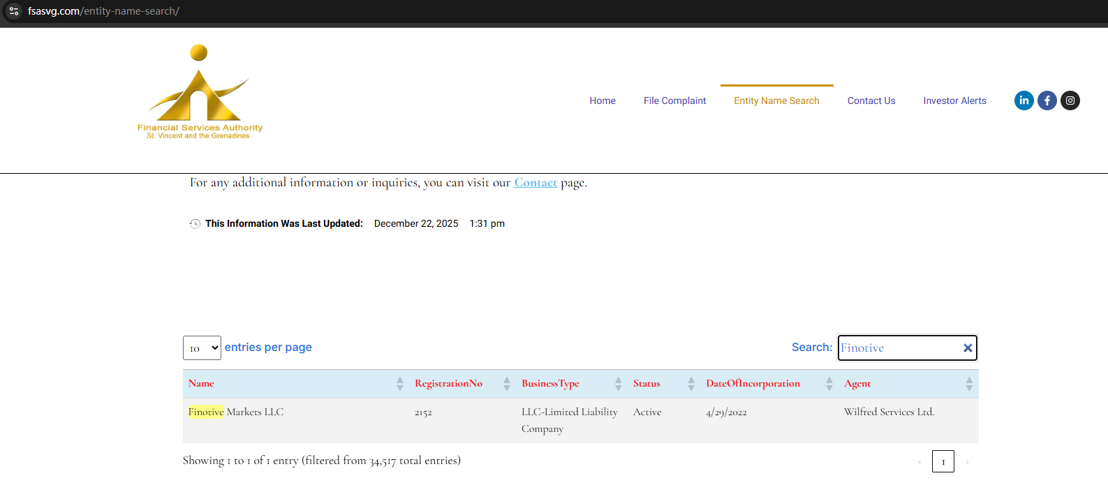 Finotive Markets only claims to be registered in Saint Vincent and the Grenadines on its website. While we can find a matching company in the Financial Services Authority (FSA) registry of Saint Vincent and the Grenadines, this only grants International Business Company (IBC) status. This does not constitute a valid financial licence. The SVG FSA has clearly stated that it does not regulate or licence forex brokers.