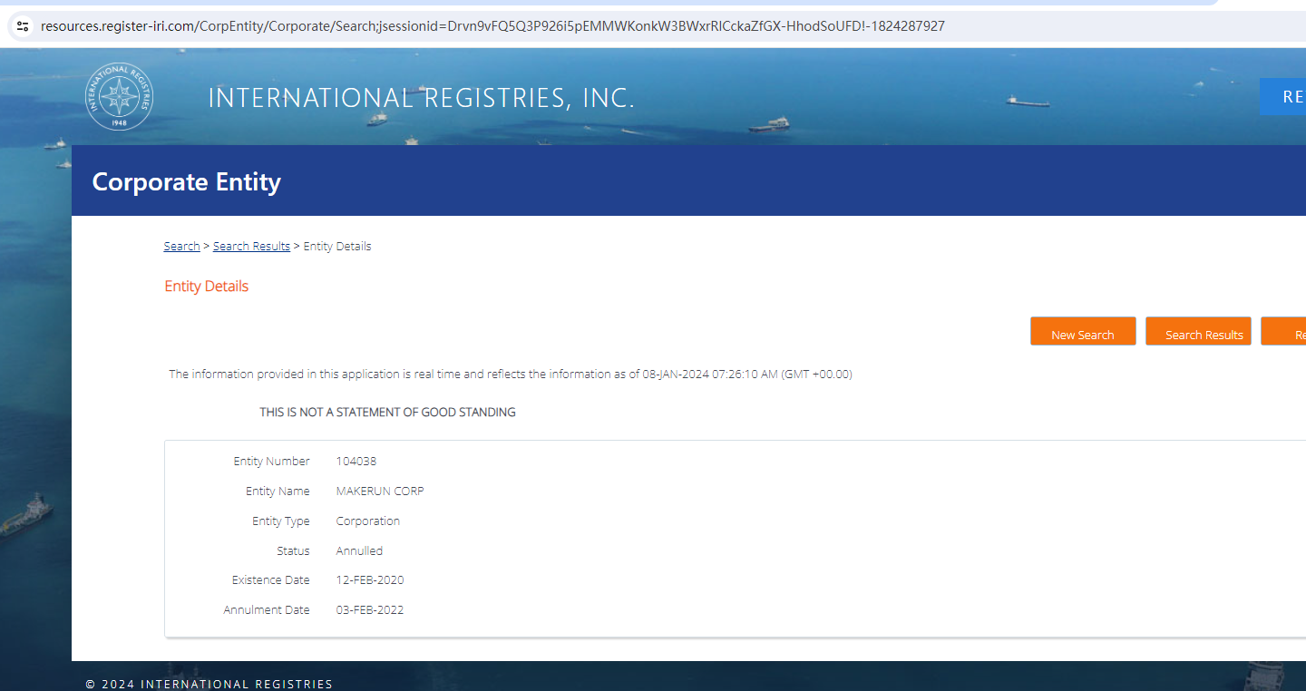 Finrally claims to be operated by Makerun Corp, which is registered with the Marshall Islands Registry (IRI), No. 104038. We searched the IRI and found a matching result, but it was annulled.