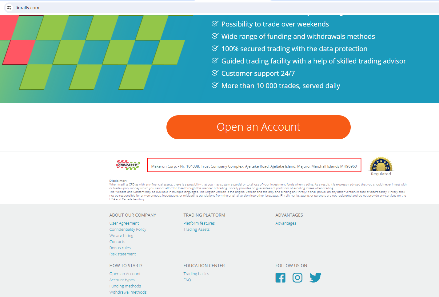 Finrally claims to be operated by Makerun Corp, which is registered with the Marshall Islands Registry (IRI), No. 104038. We searched the IRI and found a matching result, but it was annulled.The truth is that Finrally is not under valid regulation by any regulators to do forex. Investors' funds in this broker are unsafe and cannot be protected by any law.Finrally is a scam.