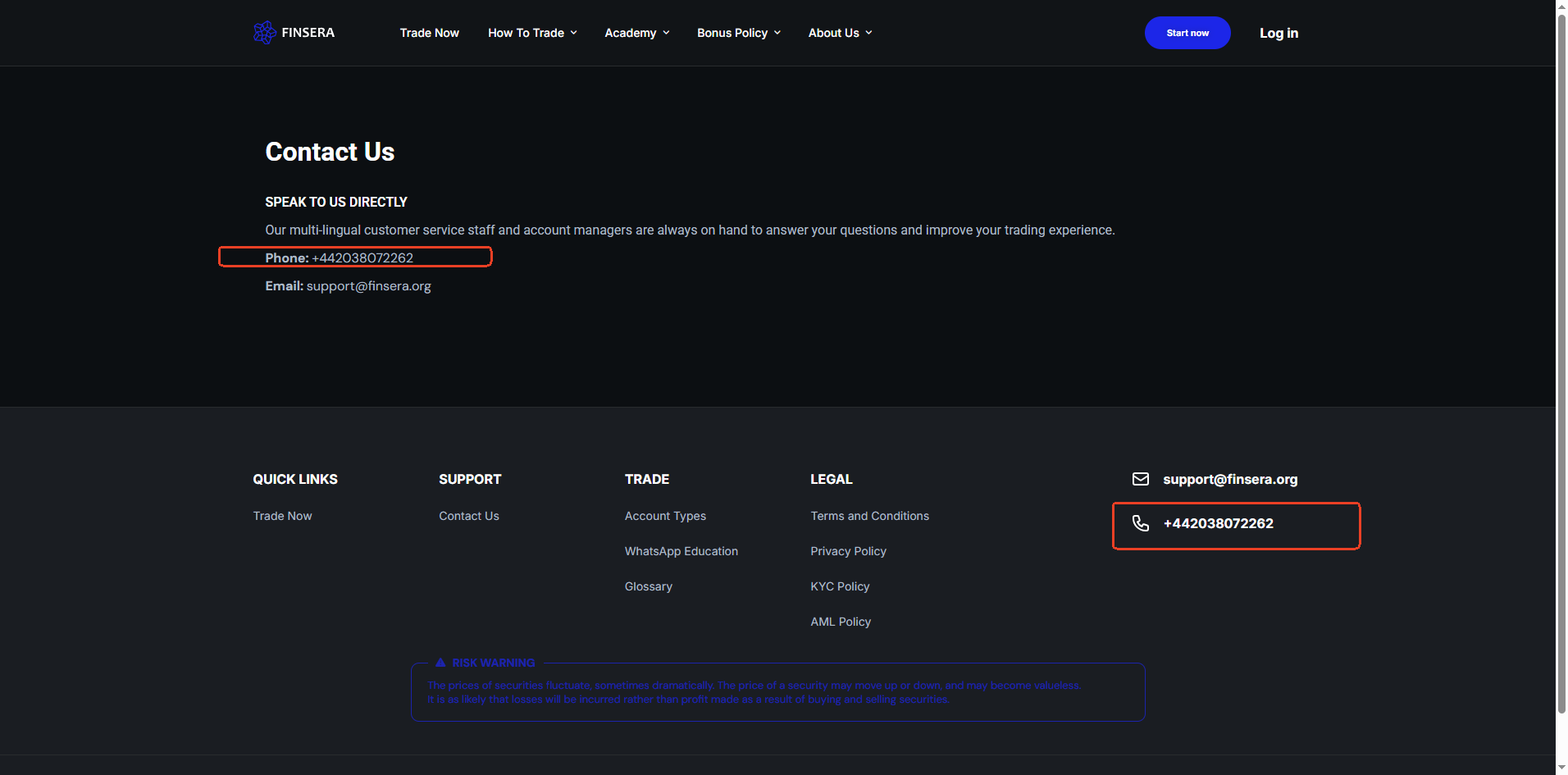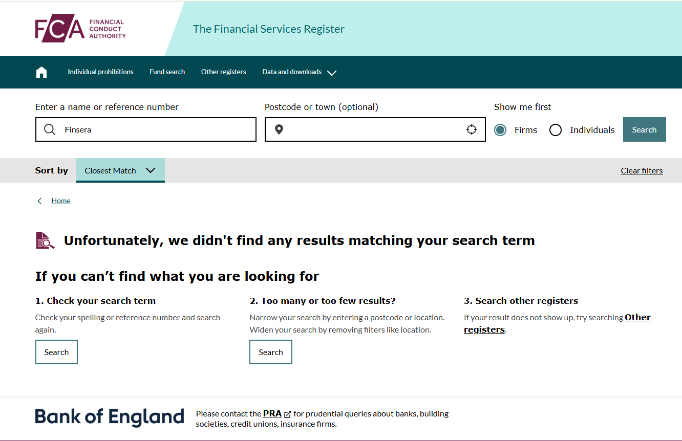 Finsera’s website provides no verifiable regulatory disclosures, legal entity name, or registered business address, but only a UK phone number is listed. And no record of Finsera or any associated company was found in the official register of the UK’s Financial Conduct Authority (FCA) .