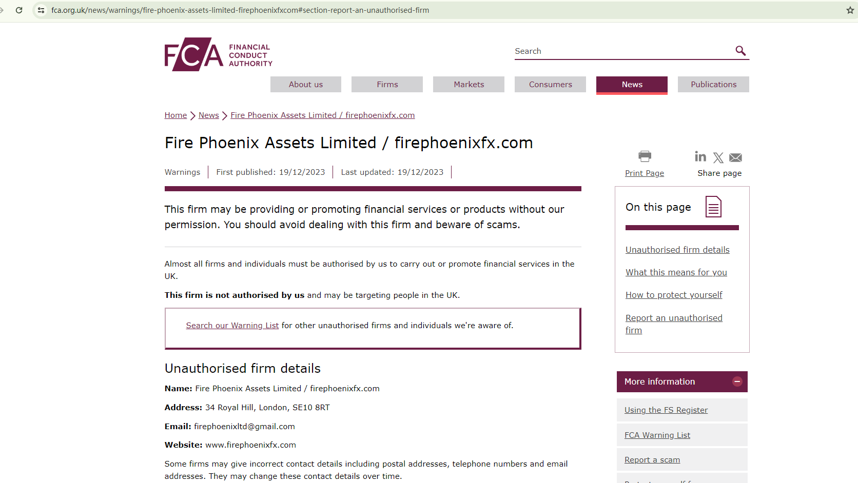 The truth is that FIRE PHOENIX is not regulated by any regulators. Letting it hold or control any investors' money is unsafe and the money cannot be protected by any laws.