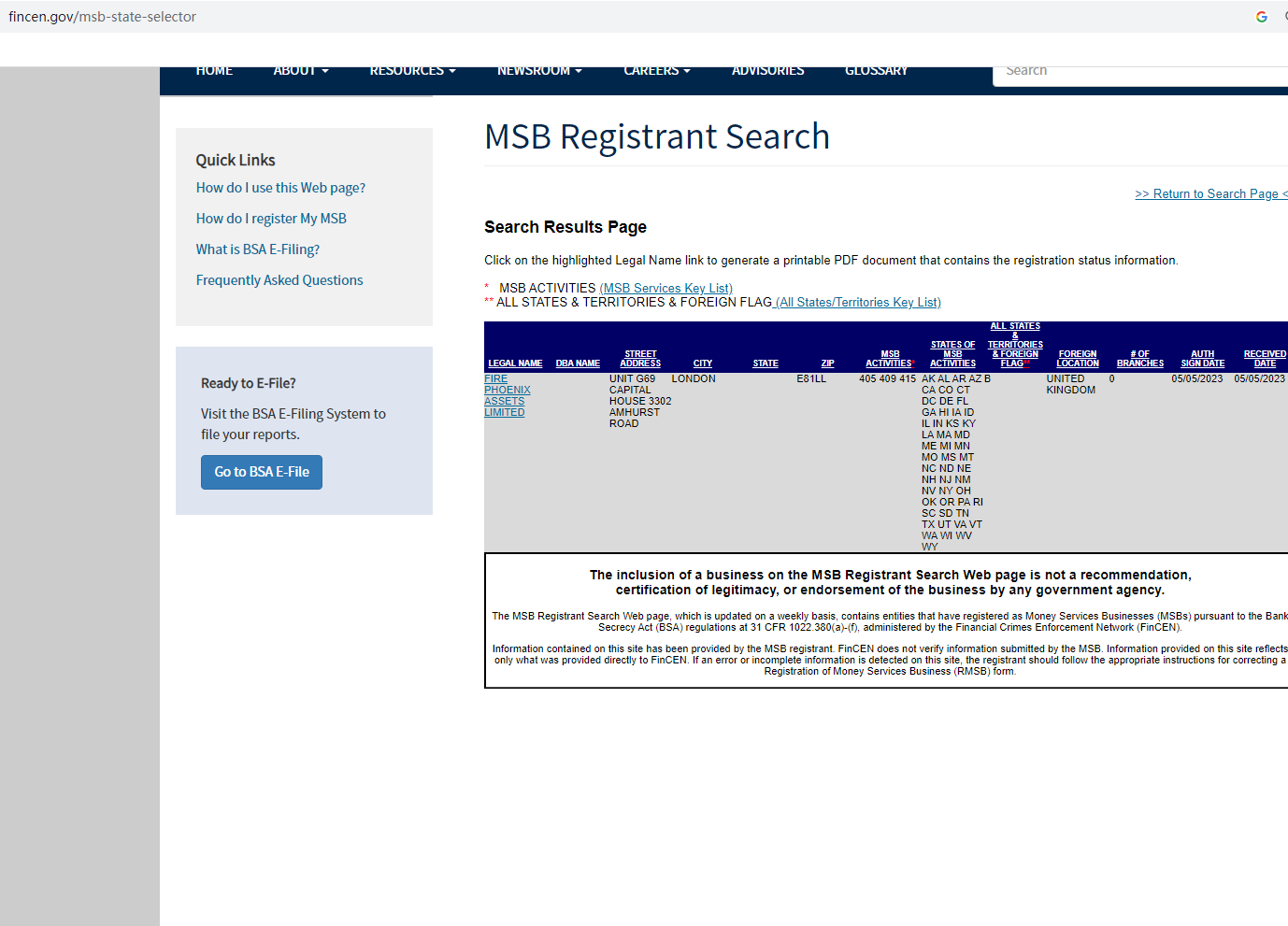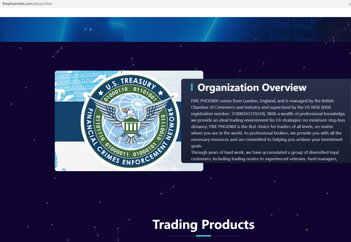 According to its website, FIRE PHOENIX comes from London, England, and is managed by the British Chamber of Commerce and Industry and supervised by the US MSB (MSB registration number: 31000243370224). However, upon investigation, we found relevant information in CH, but no matching information was found in the Financial Conduct Authority (FCA), in other words, it is only registered with CH but is not regulated by the FCA. Furthermore, we found the matching information in the MSB, but MSB is only for currency exchange business, it cannot provide foreign exchange margin business, and it has no authorization and supervision authority for financial derivatives.