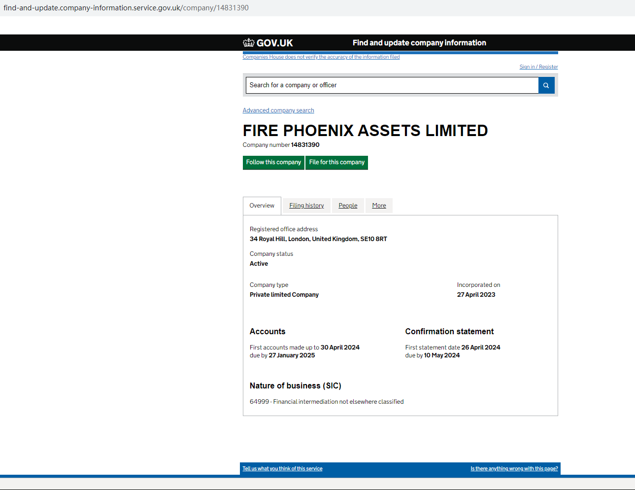 According to its website, FIRE PHOENIX comes from London, England, and is managed by the British Chamber of Commerce and Industry and supervised by the US MSB (MSB registration number: 31000243370224). However, upon investigation, we found relevant information in CH, but no matching information was found in the Financial Conduct Authority (FCA), in other words, it is only registered with CH but is not regulated by the FCA. Furthermore, we found the matching information in the MSB, but MSB is only for currency exchange business, it cannot provide foreign exchange margin business, and it has no authorization and supervision authority for financial derivatives.The truth is that FIRE PHOENIX is not regulated by any regulators. Letting it hold or control any investors' money is unsafe and the money cannot be protected by any laws.Therefore, FIRE PHOENIX is a scam.