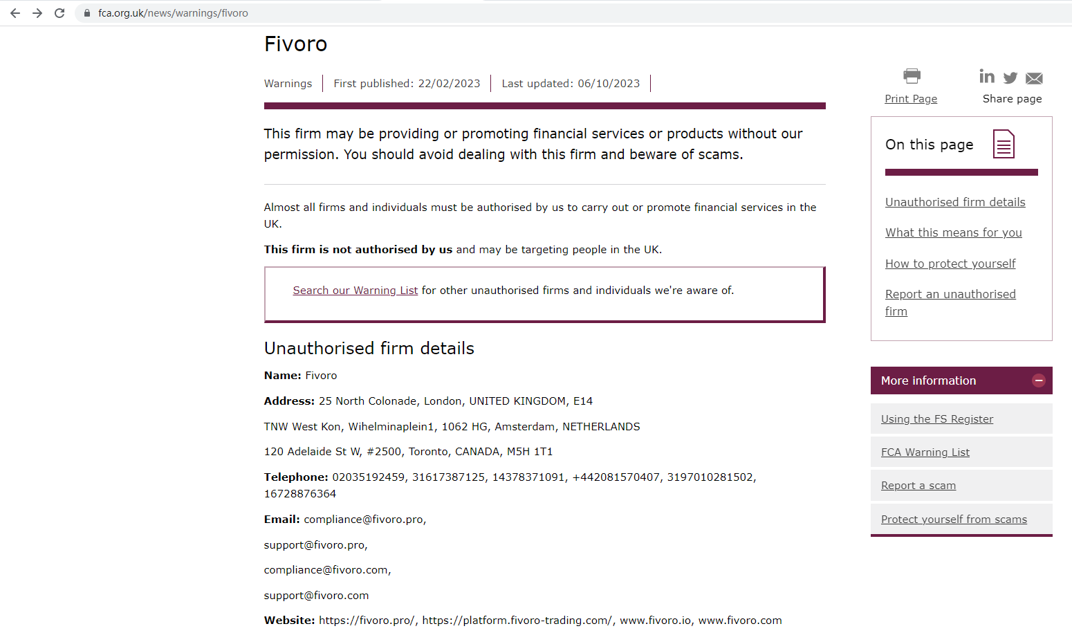 Fivoro claims to be operated by Urvashi Limited registered with the Financial Services Authority of Saint Vincent and the Grenadines (SVG FSA). However, it should be noted that the SVG FSA is an autonomous statutory body without legal authority to issue forex licenses and regulate forex markets. Fivoro also claims to be a member of Crypto Commission Authority. We searched this authority on website but found no matching results. That means, the regulatory information Fivoro claims is a false statement to unsuspecting investors. More importantly, the British Columbia Securities Commission (BCSC) issued a warning against Fivoro, saying this broker is not registered to trade in, or advise on, securities or derivatives in BC.
