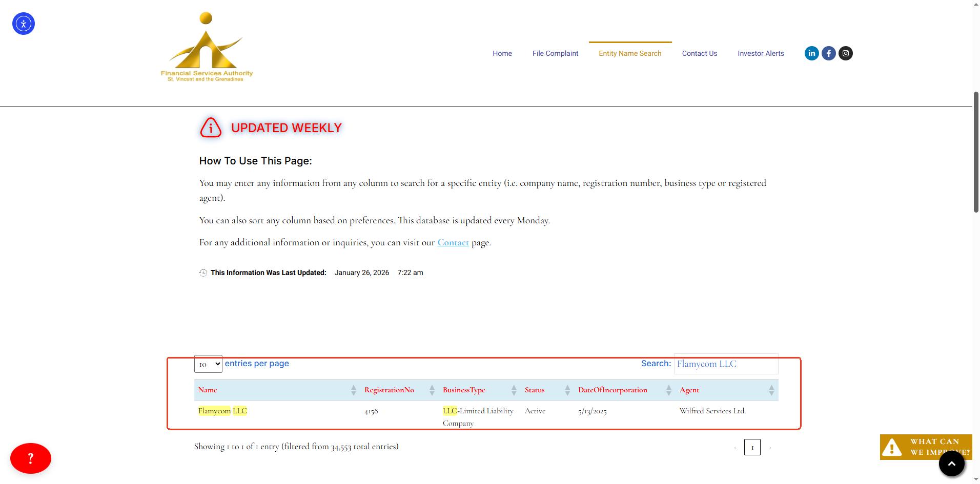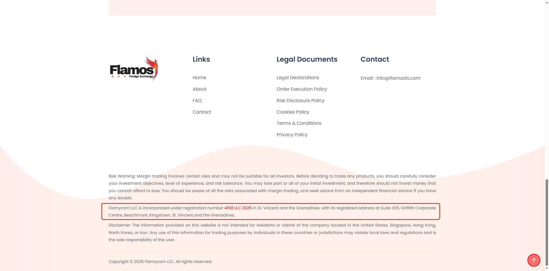 Flamos only claims to be registered in Saint Vincent and the Grenadines on its website. While we can find a matching company in the Financial Services Authority (FSA) registry of Saint Vincent and the Grenadines, this only grants International Business Company (IBC) status. This does not constitute a valid financial licence. The SVG FSA has clearly stated that it does not regulate or licence forex brokers.
