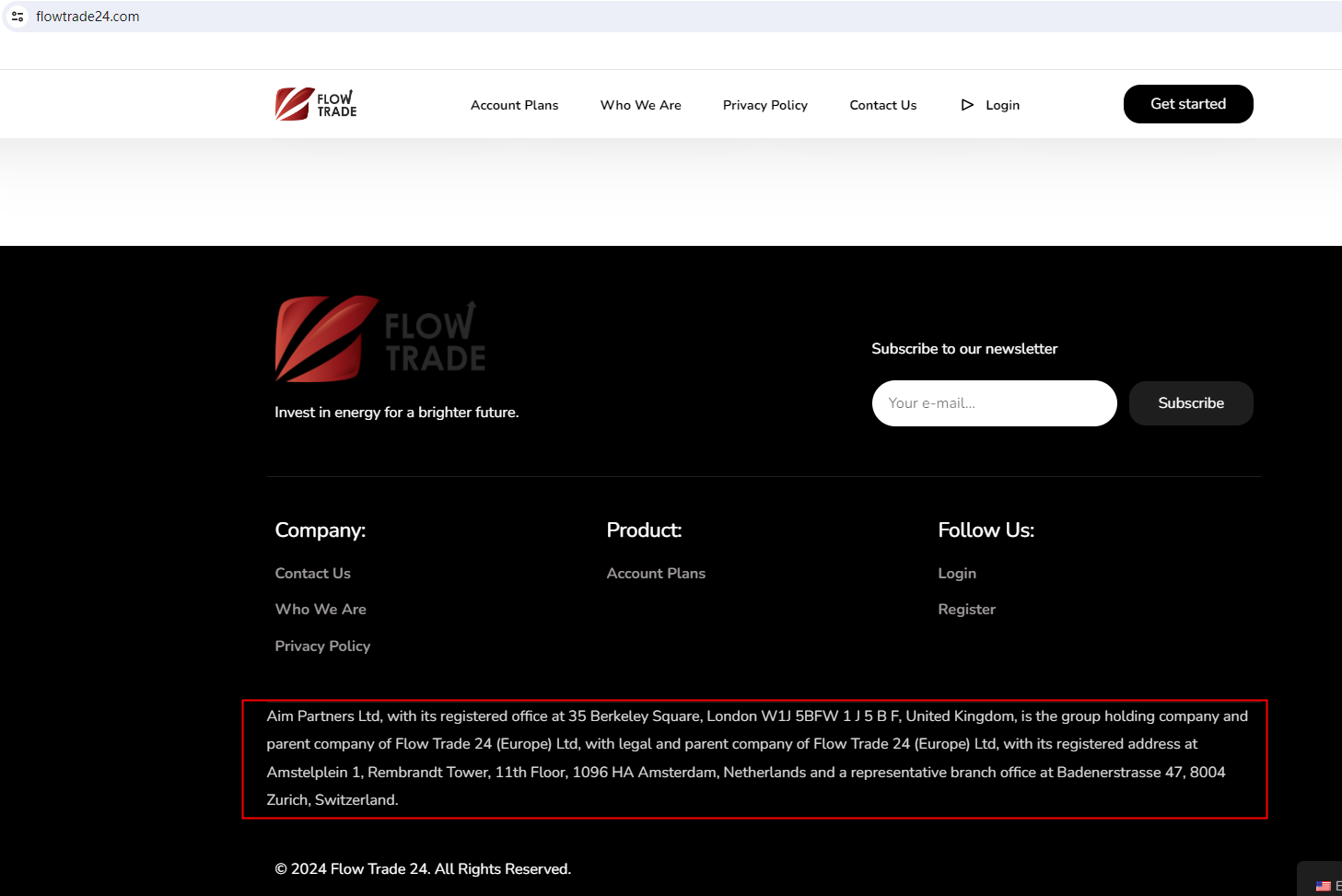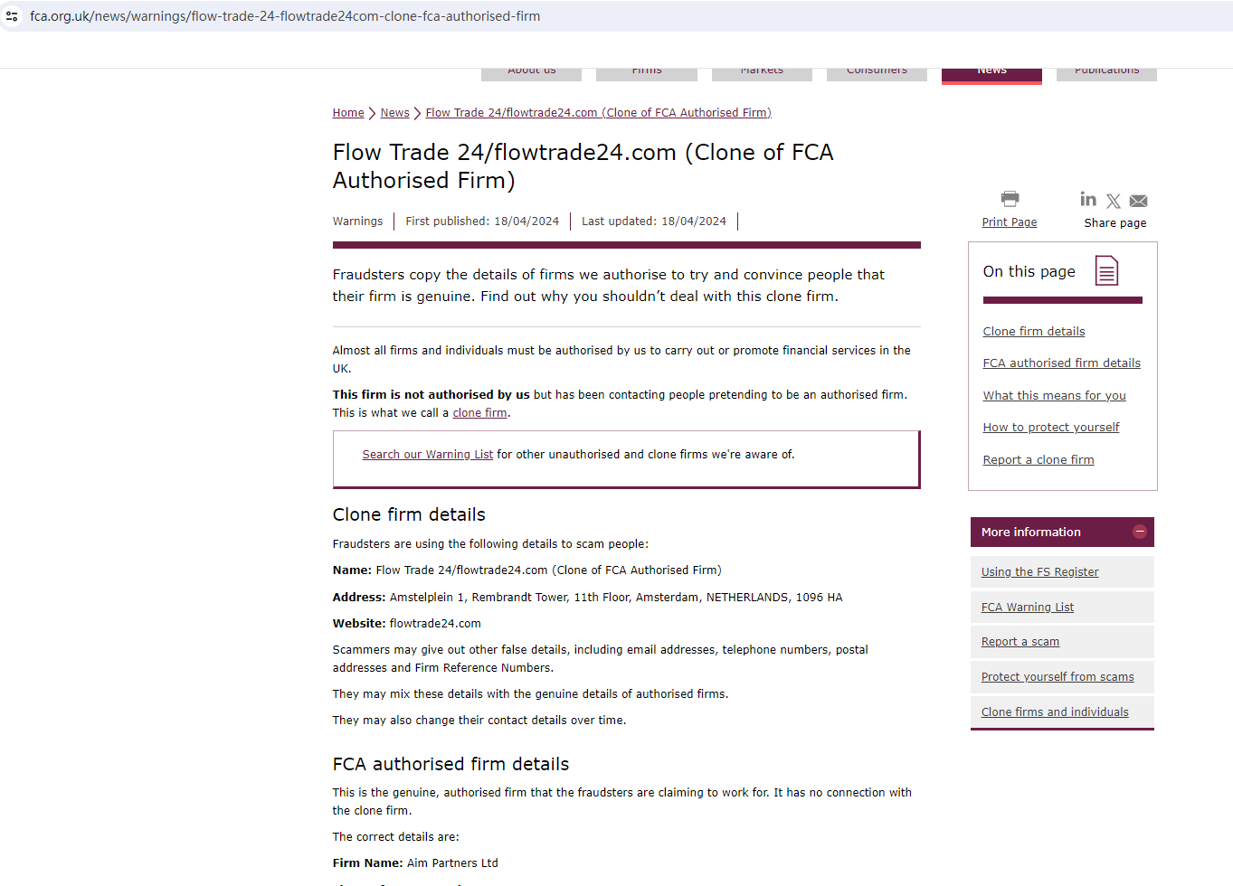 Flow Trade 24 made unauthorized use of information from FCA authorized company Aim Partners Ltd and falsely represented the company as its parent company. In fact, the brand has no relationship with Aim Partners Ltd. In order to expose this illegal behavior and scam, the FCA has issued a warning against Flow Trade 24, clearly stating that it is a clone company and reminding investors to stay away from this scam.