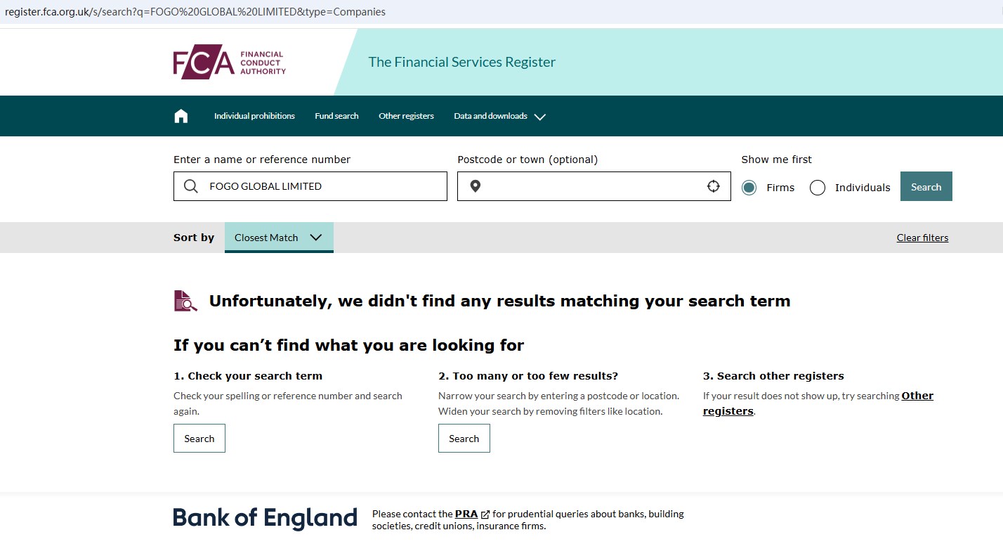 FOGO claims to be owned and operated by FOGO GLOBAL LIMITED headquartered in the UK, is a broker regulated by the the Money Services Business (MSB) of the United States, which offers a range of investment products to traders, including Forex, Stocks, Indices, Commodities, Crypto, Metals, Energy and more instruments for trading in global markets.Upon investigation, we found that FOGO GLOBAL LIMITED is registered with the US MSB, but the business of the MSB is only currency exchange, cannot license forex trading brokerage activities, and has no authorization for financial derivatives.And FOGO is not regulated and authorized by the United Kingdom Financial Conduct Authority (FCA).The truth is that FOGO is not regulated by any regulators. Letting it hold or control investors'money is unsafe, and the money can not be protected by any laws.FOGO is a scam.