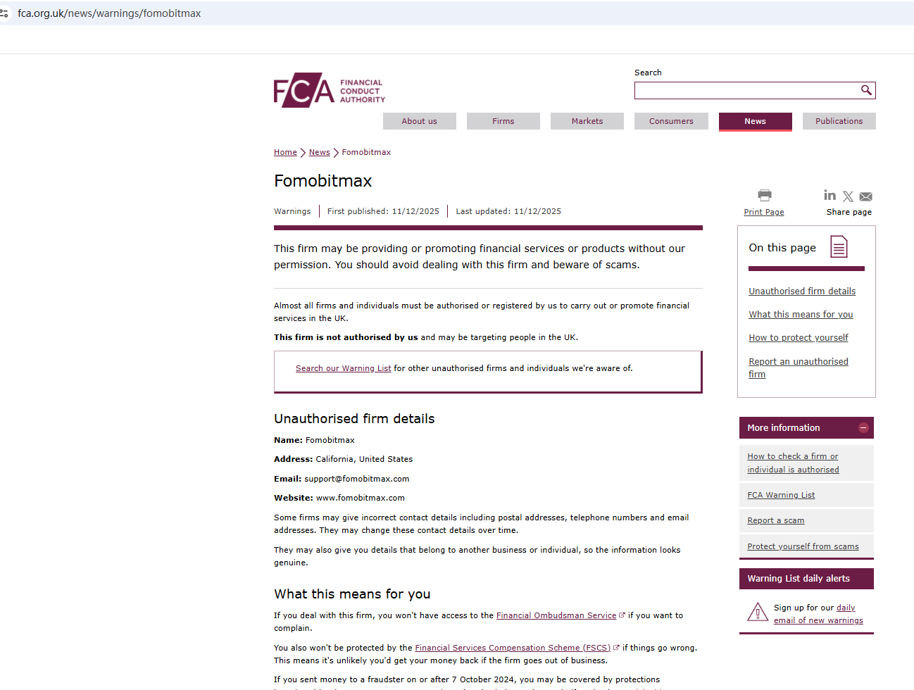 On Dec 11, 2025, the Financial Conduct Authority (FCA) issued a warning regarding Fomobitmax, suspecting that this company may be offering financial services or products without the necessary authorization. https://www.fca.org.uk/news/warnings/fomobitmax