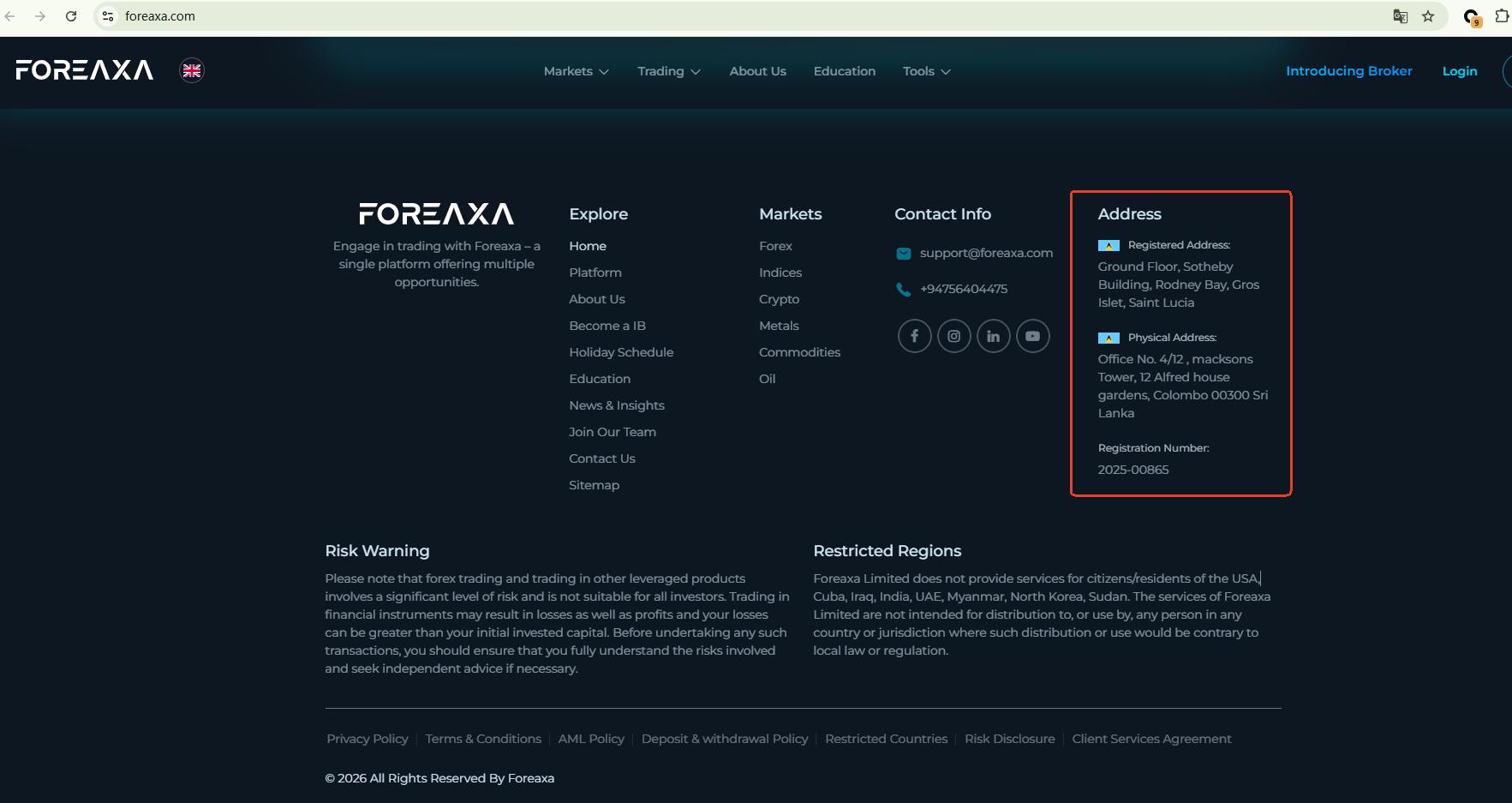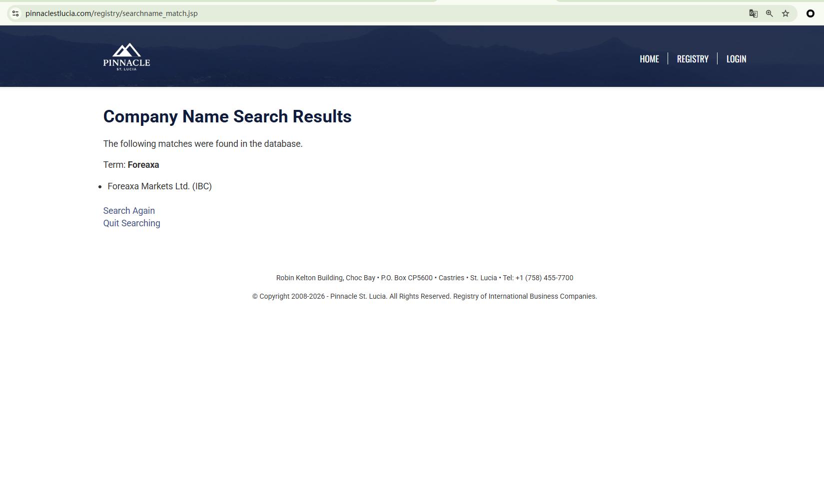 Foreaxa does not claim to be licensed by any regulator; it only claims to be registered in Saint Lucia. While we can confirm that there is a company with the same name in the Saint Lucia International Financial Centre (IFC) registry, this registration only grants it International Business Company (IBC) status. This does not constitute a valid financial licence. The IFC neither regulates nor licences forex trading activities.