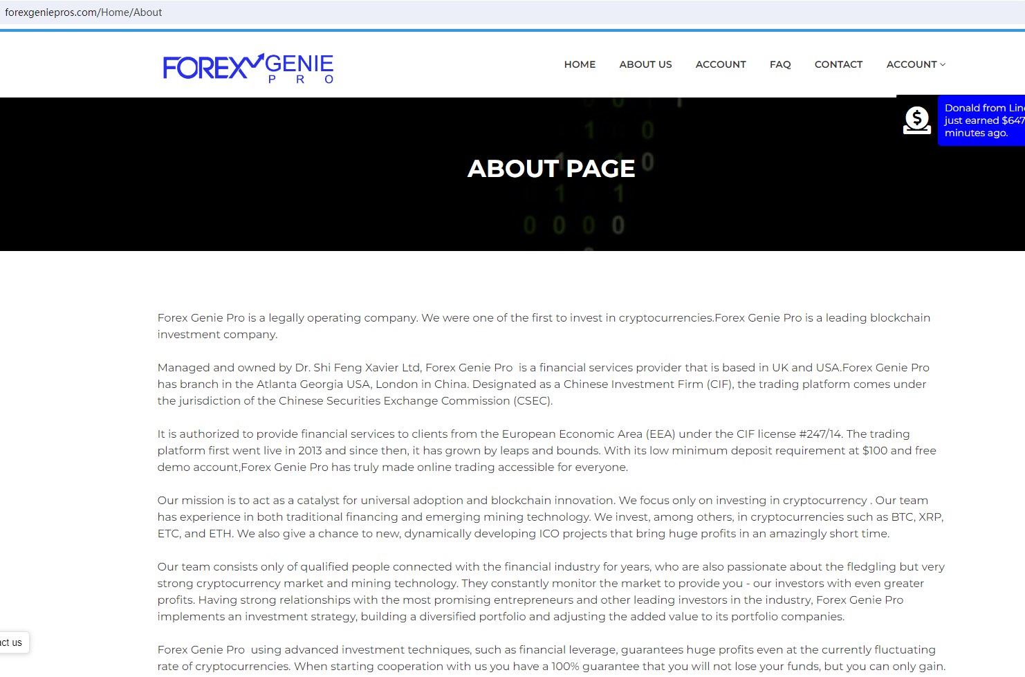Forex Genie Pro claims to be a legal investment company managed and owned by Dr. Shi Feng Xavier Ltd, and based in UK, USA and China authorized by the European Economic Area (EEA) under the CIF license 247/14, offering wide range of financial services, including Forex, Cryptocurrencies and more instruments in global markets. As a Chinese Investment Firm, the trading platform comes under the jurisdiction of the Chinese Securities Exchange Commission (CSEC).