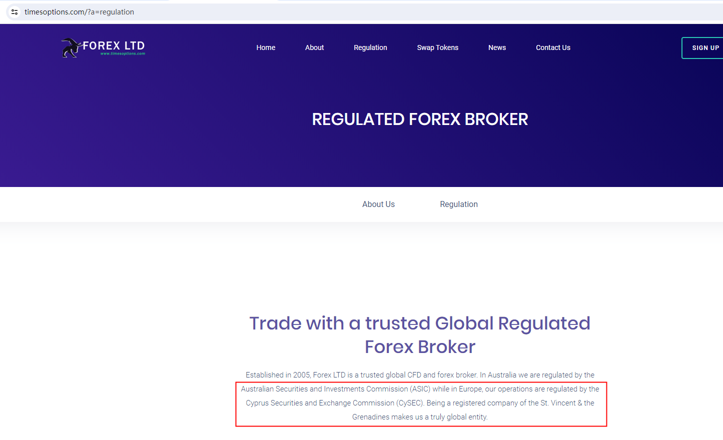FOREX LTD claims to be regulated by the Australian Securities and Investments Commission (ASIC), Cyprus Securities and Exchange Commission (CySEC) and registered in Financial Services Authority (FSA) of Saint Vincent and the Grenadines.