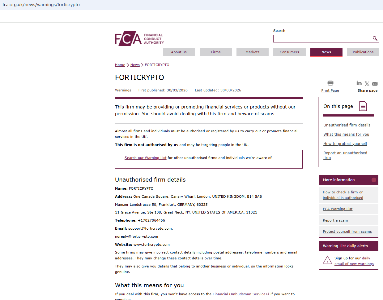 On Mar 30, 2026, the Financial Conduct Authority (FCA) issued a warning regarding Forticrypto, suspecting that this company may be offering financial services or products without the necessary authorization. https://www.fca.org.uk/news/warnings/forticrypto