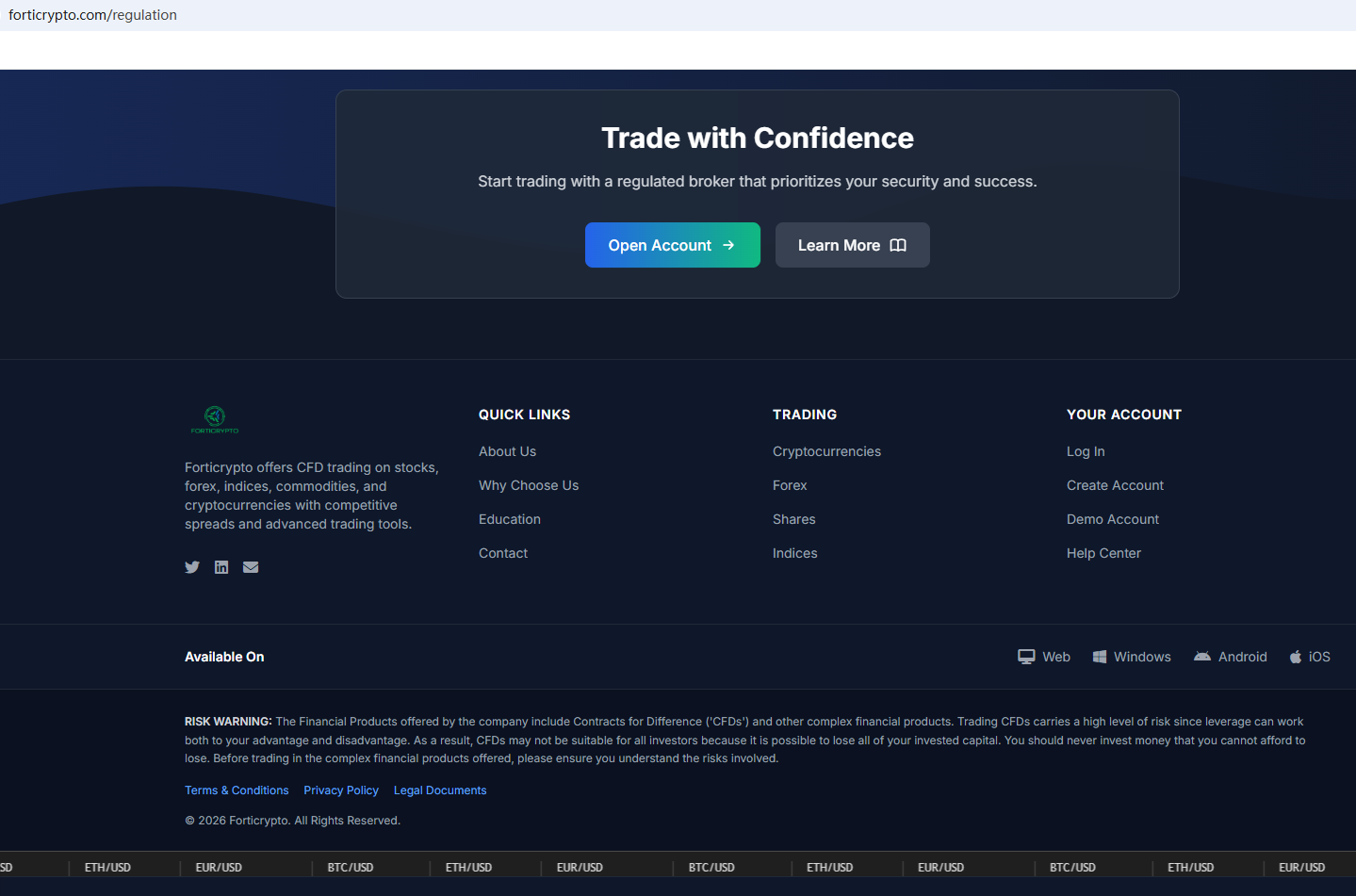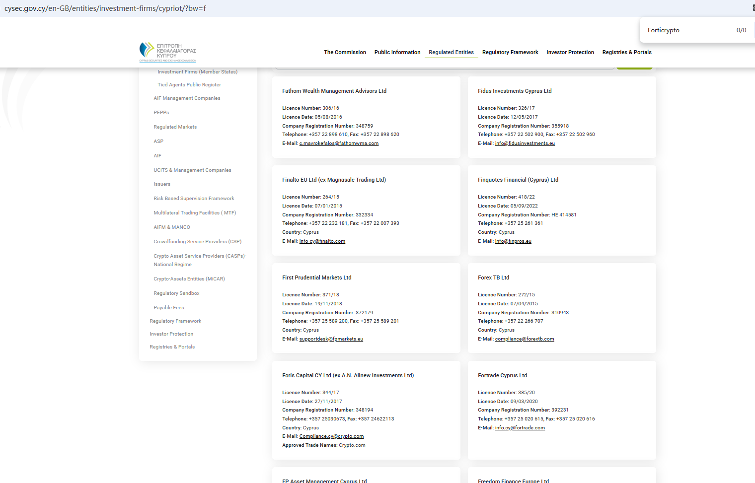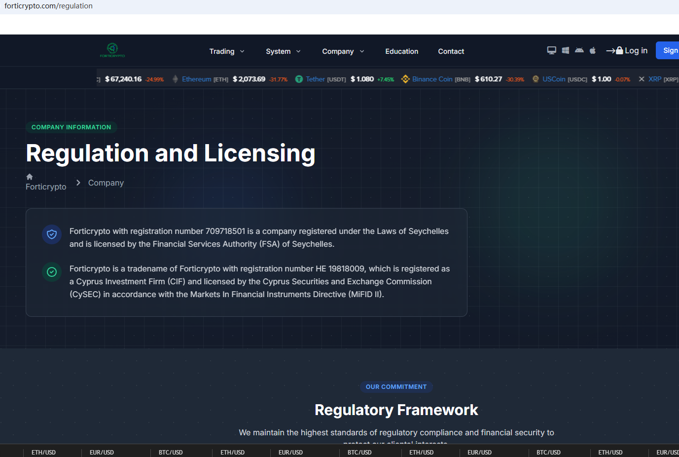 According to its website, it claims to be regulated by the Seychelles Financial Services Authority (Seychelles FSA) and the Cyprus Securities and Exchange Commission (CySEC). Upon investigation, no matching information was found in the Seychelles FSA and CySEC. In addition, the Financial Conduct Authority (FCA) issued a warning regarding Forticrypto, suspecting that this company may be offering financial services or products without the necessary authorization.