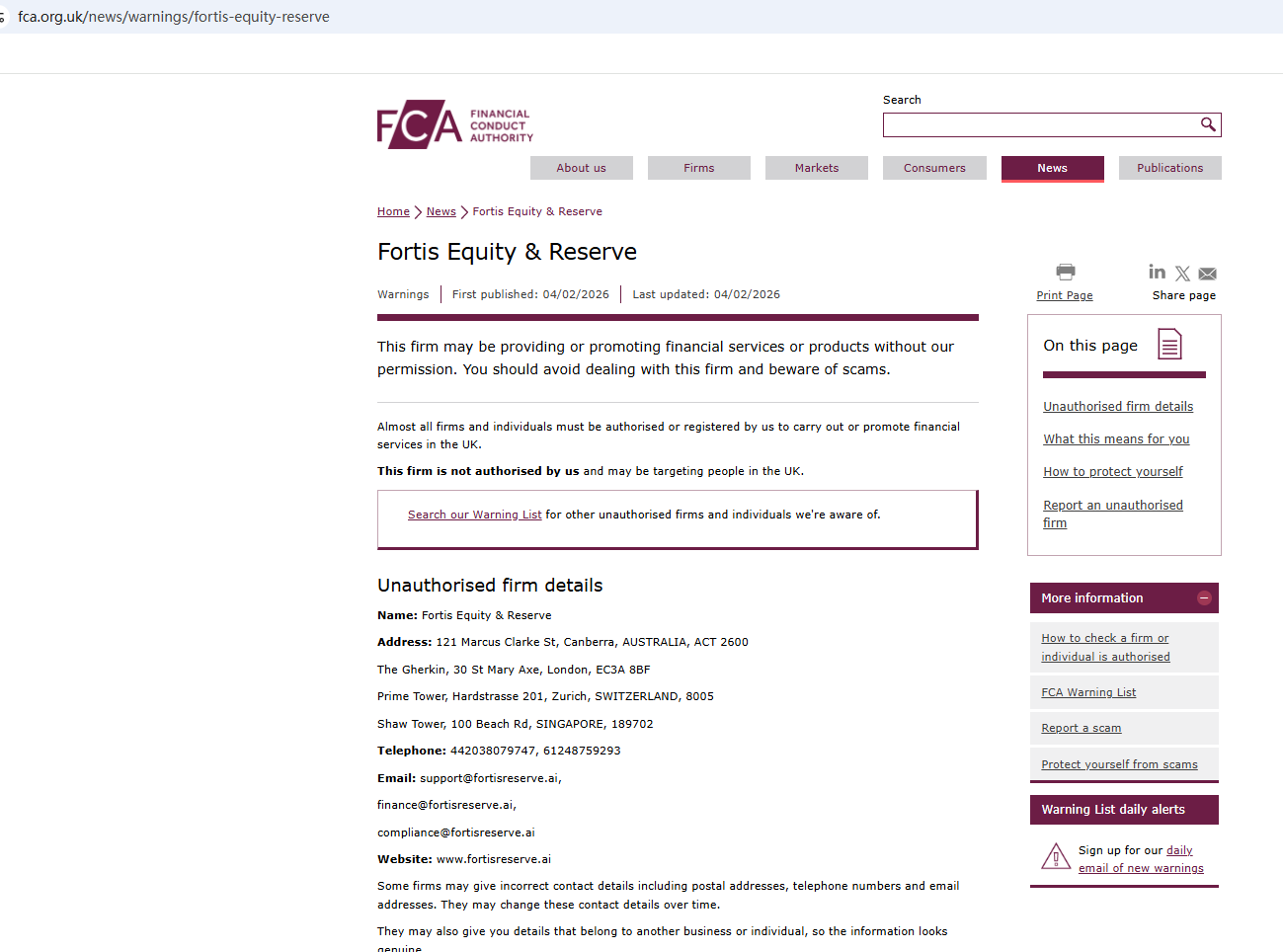 On Feb 4, 2026, the Financial Conduct Authority (FCA) issued a warning regarding FortisReserve, suspecting that this company may be offering financial services or products without the necessary authorization. https://www.fca.org.uk/news/warnings/fortis-equity-reserve