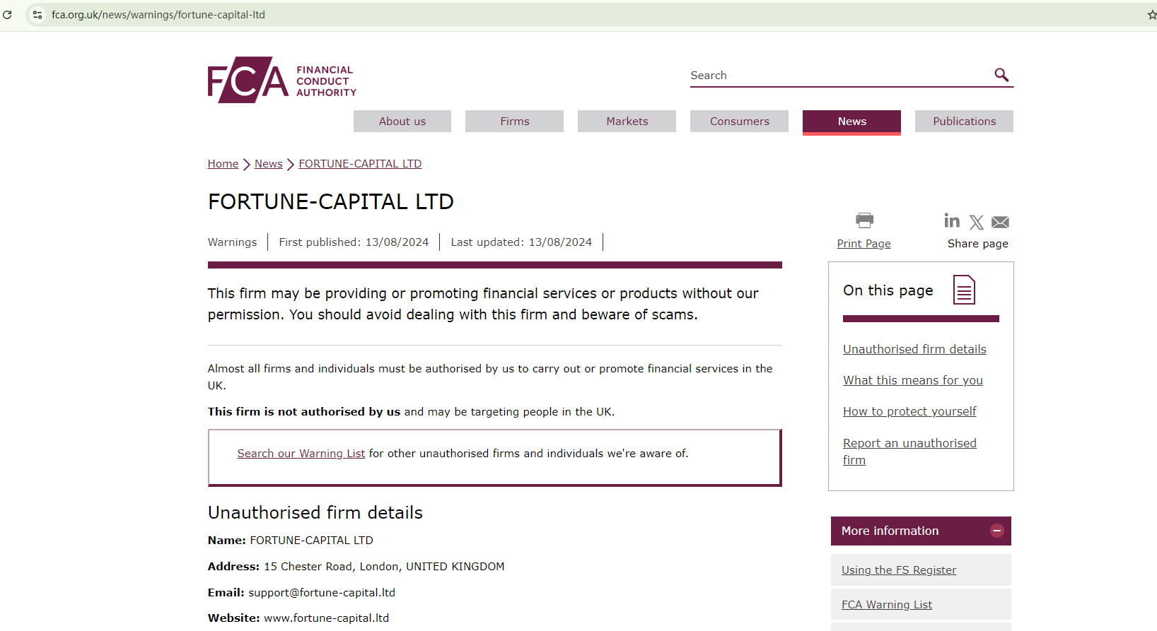 In addition, the UK's financial regulator, Financial Conduct Authority (FCA) has issued a warning against FORTUNE CAPITAL LTD, flagging it as an unauthorized firm in the country.