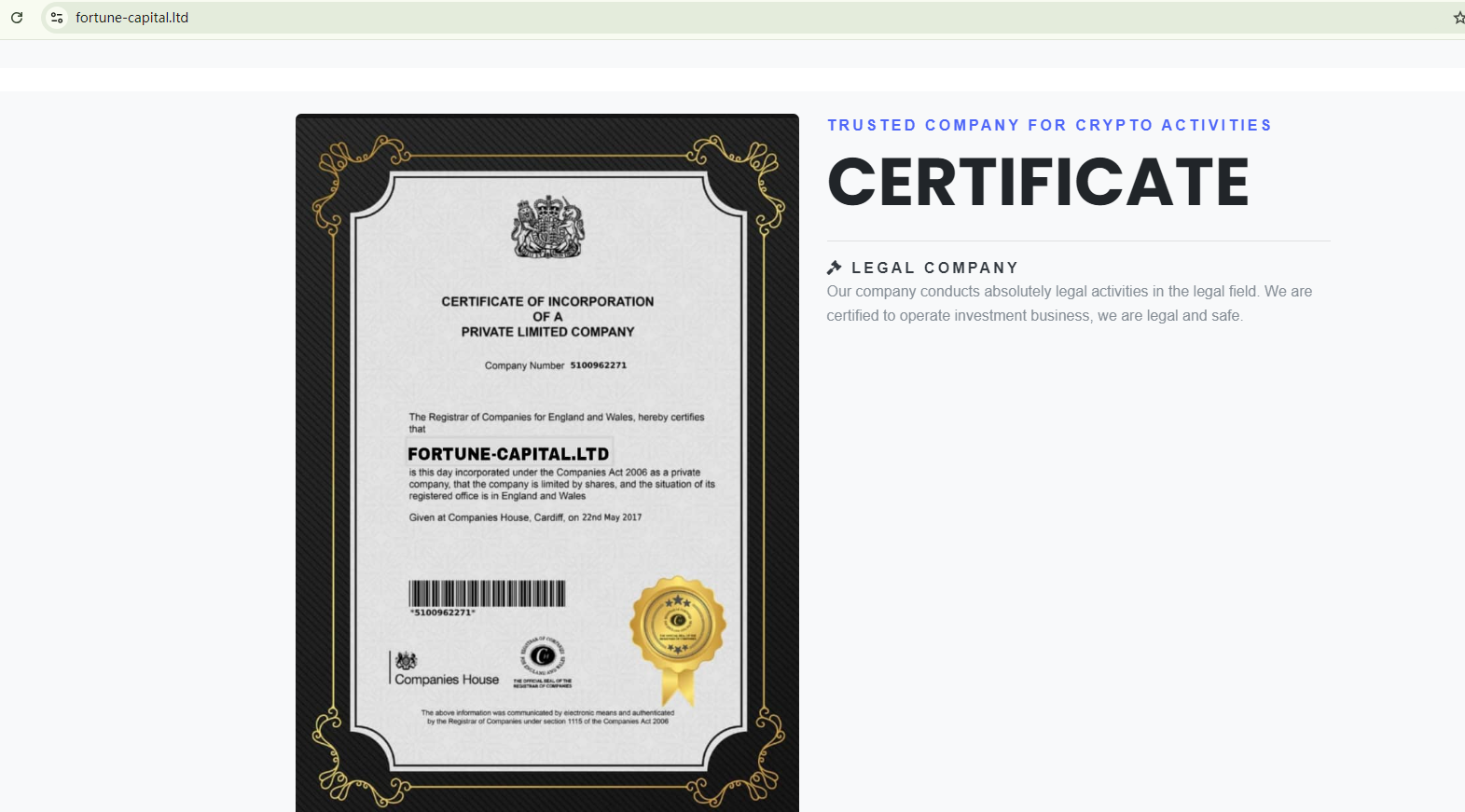 FORTUNE CAPITAL LTD claims to be registered in the UK, purporting to have a certificate from the Companies House (CH). However, the provided certificate is apparently altered and our search for the alleged company number in the CH register hasn't located any corresponding records. This means the certificate is falsified.