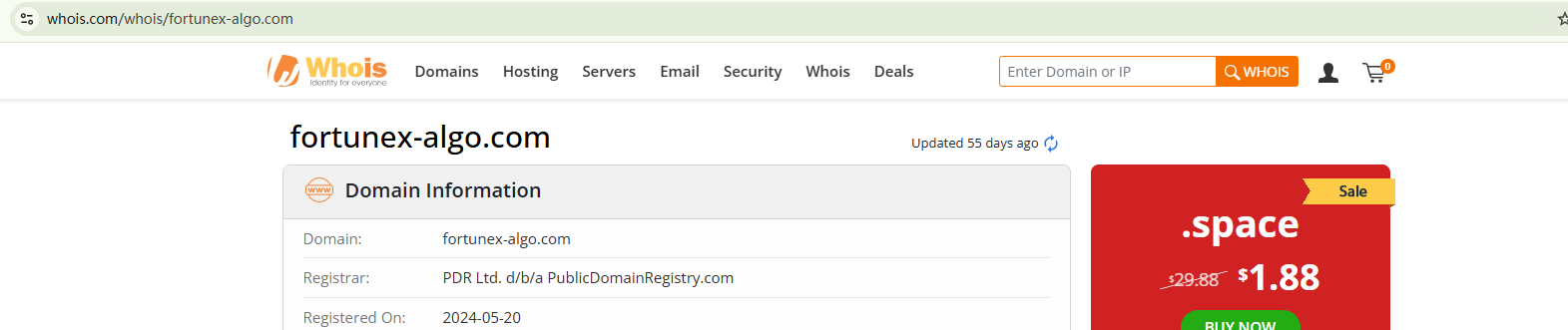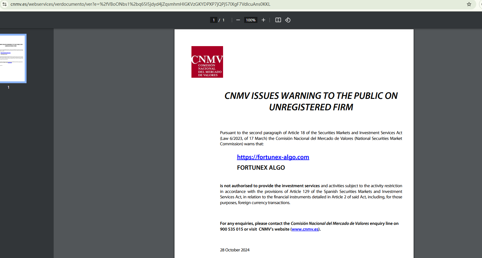 FORTUNEX ALGO appears to be a new trading platform, using a website template for a quick setup. Its domain was registered in late May 2024. The broker fails to provide any valid company or licensing information to prove its legitimacy. Additionally, the Comisión Nacional del Mercado de Valores (CNMV) has added FORTUNEX ALGO to its warning list for providing investment services without authorization.