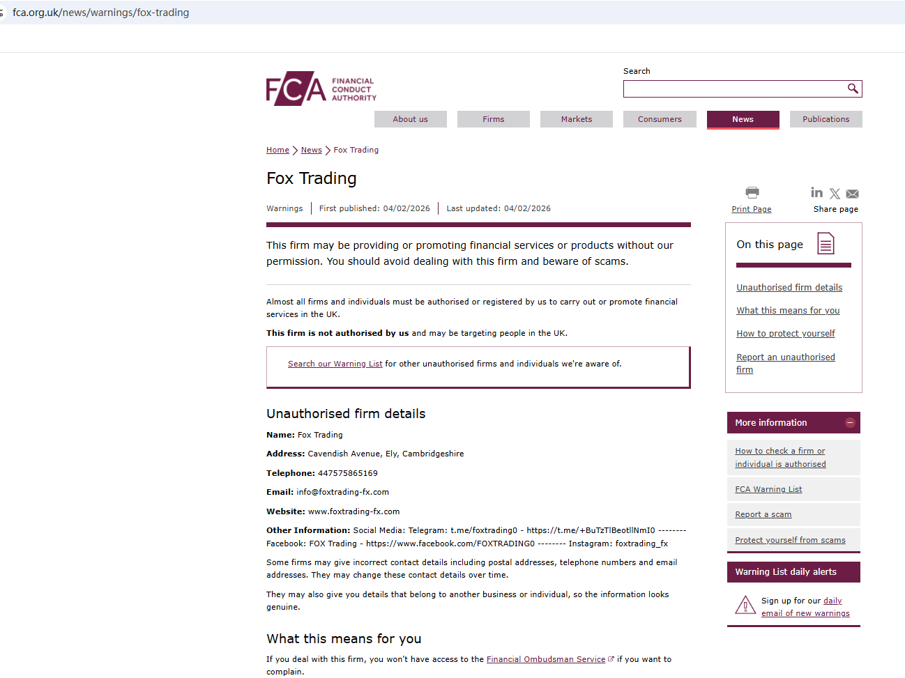 On Feb 4, 2026, the Financial Conduct Authority (FCA) issued a warning regarding Fox Trading, suspecting that this company may be offering financial services or products without the necessary authorization. https://www.fca.org.uk/news/warnings/fox-trading