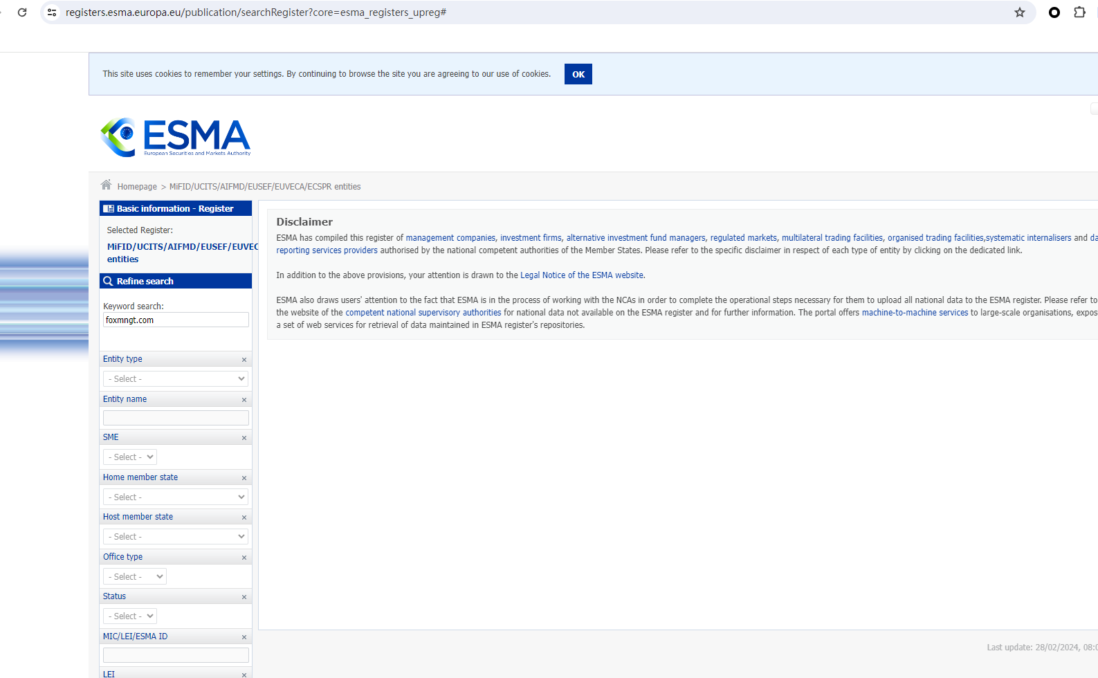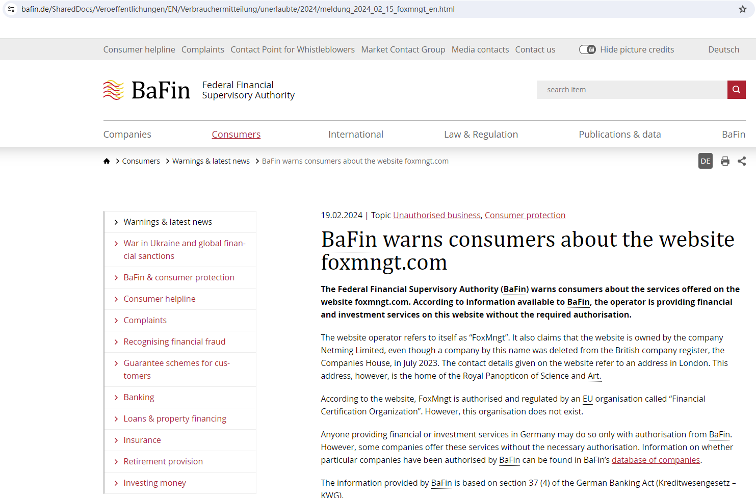 Furthermore, the Federal Financial Supervisory Authority (BaFin) warned consumers about the services offered by the company Foxmngt, which is offering financial and investment services without the required authorization.