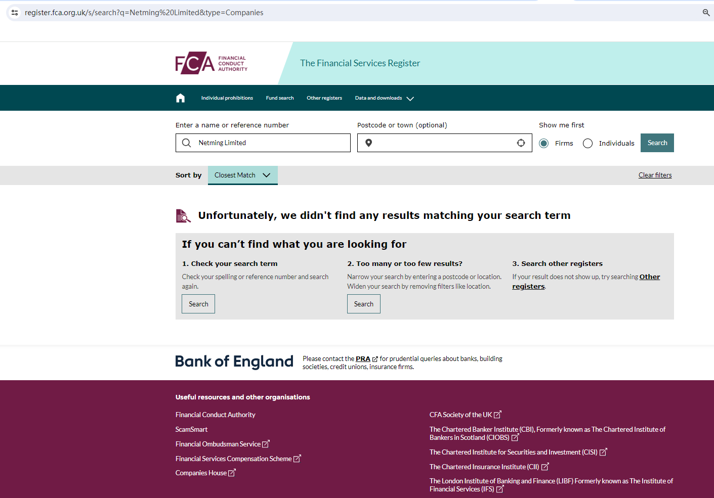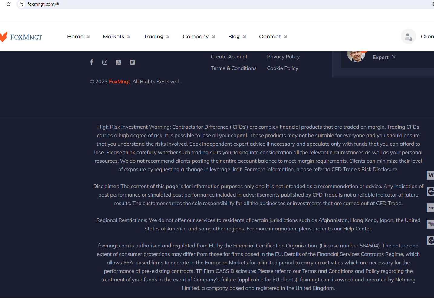 According to its website, it claims regulated by EU by the Financial Certification Organization. Upon investigation, no matching information was found in the European Securities and Markets Authority (ESMA). In addition, foxmngt.com is owned and operated by Netming Limited, a company based and registered in the United Kingdom. Upon investigation, no matching information was found in the Financial Conduct Authority (FCA).