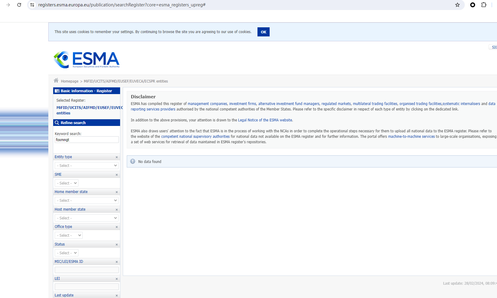According to its website, it claims regulated by EU by the Financial Certification Organization. Upon investigation, no matching information was found in the European Securities and Markets Authority (ESMA). In addition, foxmngt.com is owned and operated by Netming Limited, a company based and registered in the United Kingdom. Upon investigation, no matching information was found in the Financial Conduct Authority (FCA).Furthermore, the Federal Financial Supervisory Authority (BaFin) warned consumers about the services offered by the company Foxmngt, which is offering financial and investment services without the required authorization.In essence, Foxmngt is not regulated by any governing body. Entrusting this broker with investors' funds is highly risky, as there are no legal protections in place to safeguard the funds.Foxmngt appears to be a scam.