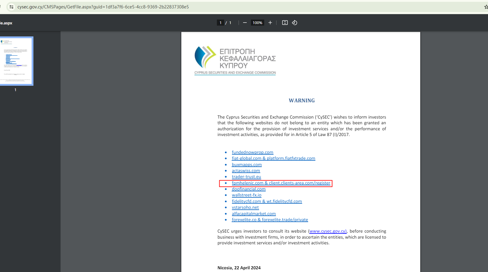 FPM Helenic is found to be illicitly using the regulatory information of FP Markets. Our investigation in the register of the Cyprus Securities and Exchange Commission (CySEC), along with the warning issued by CySEC, further substantiates that FPM Helenic is not affiliated with any entity licensed or regulated by CySEC.
