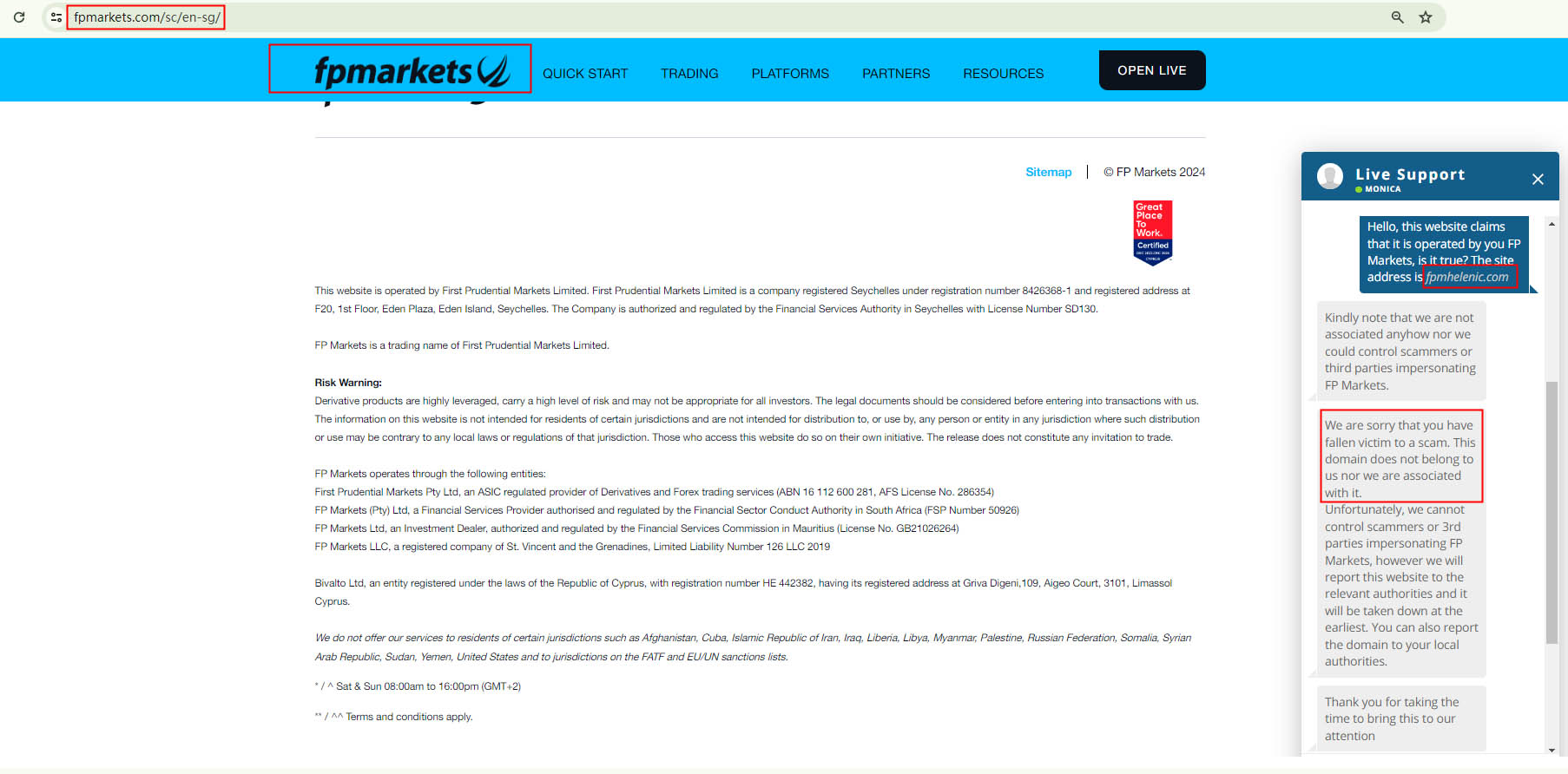 FPM Helenic is a fraudulent website that deliberately mimics the layout and content of the legitimate broker, FP Markets. This is done to create a false sense of legitimacy or to suggest a potential affiliation with the genuine entity. We have specifically prepared a comparison between these two sites, as depicted in the following image (FP Markets is on the left, and FPM Helenic is on the right).FPM Helenic is found to be illicitly using the regulatory information of FP Markets. Our investigation in the register of the Cyprus Securities and Exchange Commission (CySEC), along with the warning issued by CySEC, further substantiates that FPM Helenic is not affiliated with any entity licensed or regulated by CySEC.Moreover, compelling evidence of FPM Helenic's fraudulent activities comes from FP Markets themselves. They have confirmed that fpmhelenic.com is not associated with them and appears to be a scam. This clearly indicates the deceptive nature of FPM Helenic.In essence, FPM Helenic is not regulated by any governing body. Entrusting it with investors' funds is highly risky, as there are no legal protections in place to safeguard the funds.FPM Helenic appears to be a scam.