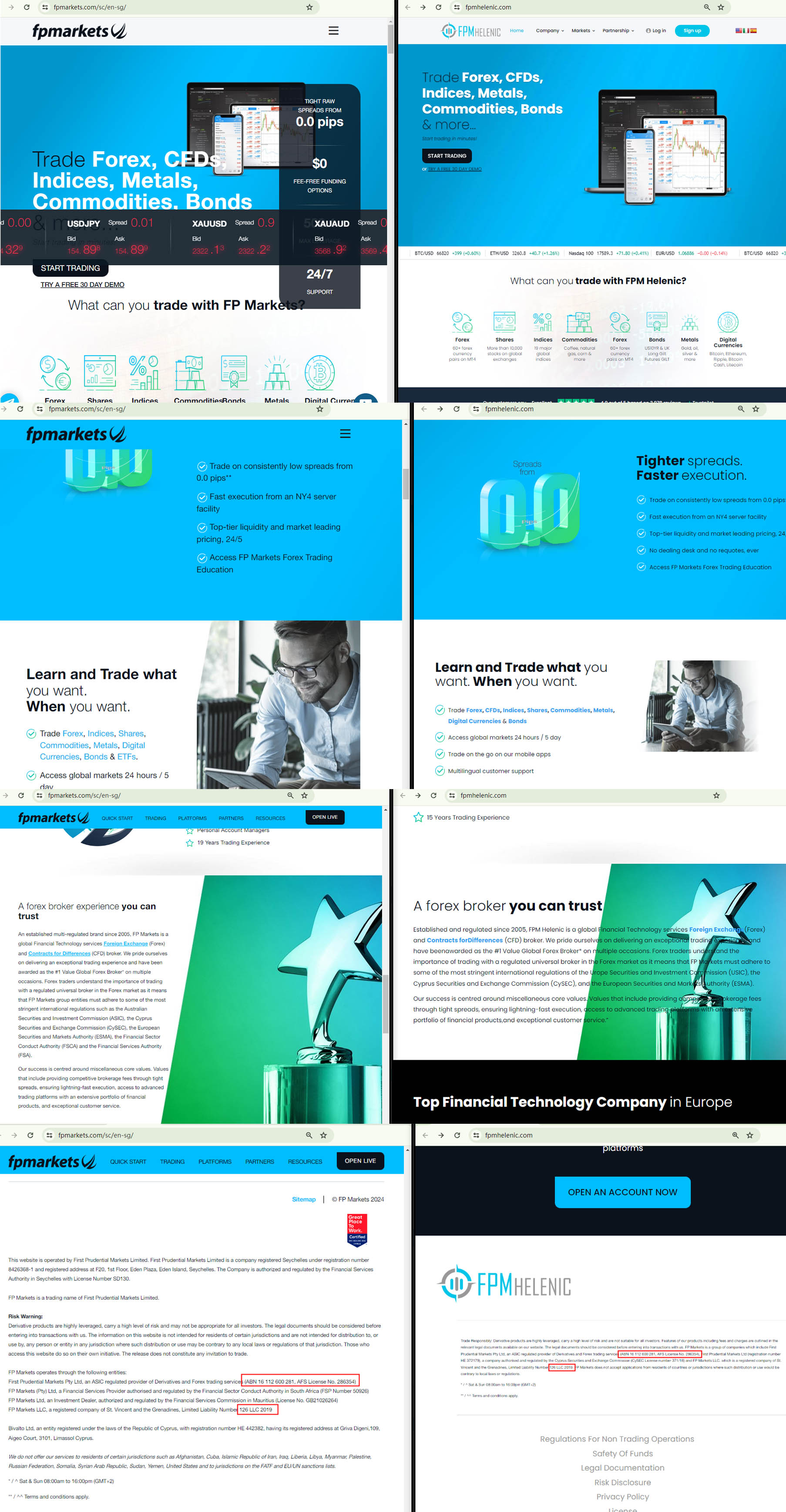 FPM Helenic is a fraudulent website that deliberately mimics the layout and content of the legitimate broker, FP Markets. This is done to create a false sense of legitimacy or to suggest a potential affiliation with the genuine entity. We have specifically prepared a comparison between these two sites, as depicted in the following image (FP Markets is on the left, and FPM Helenic is on the right).