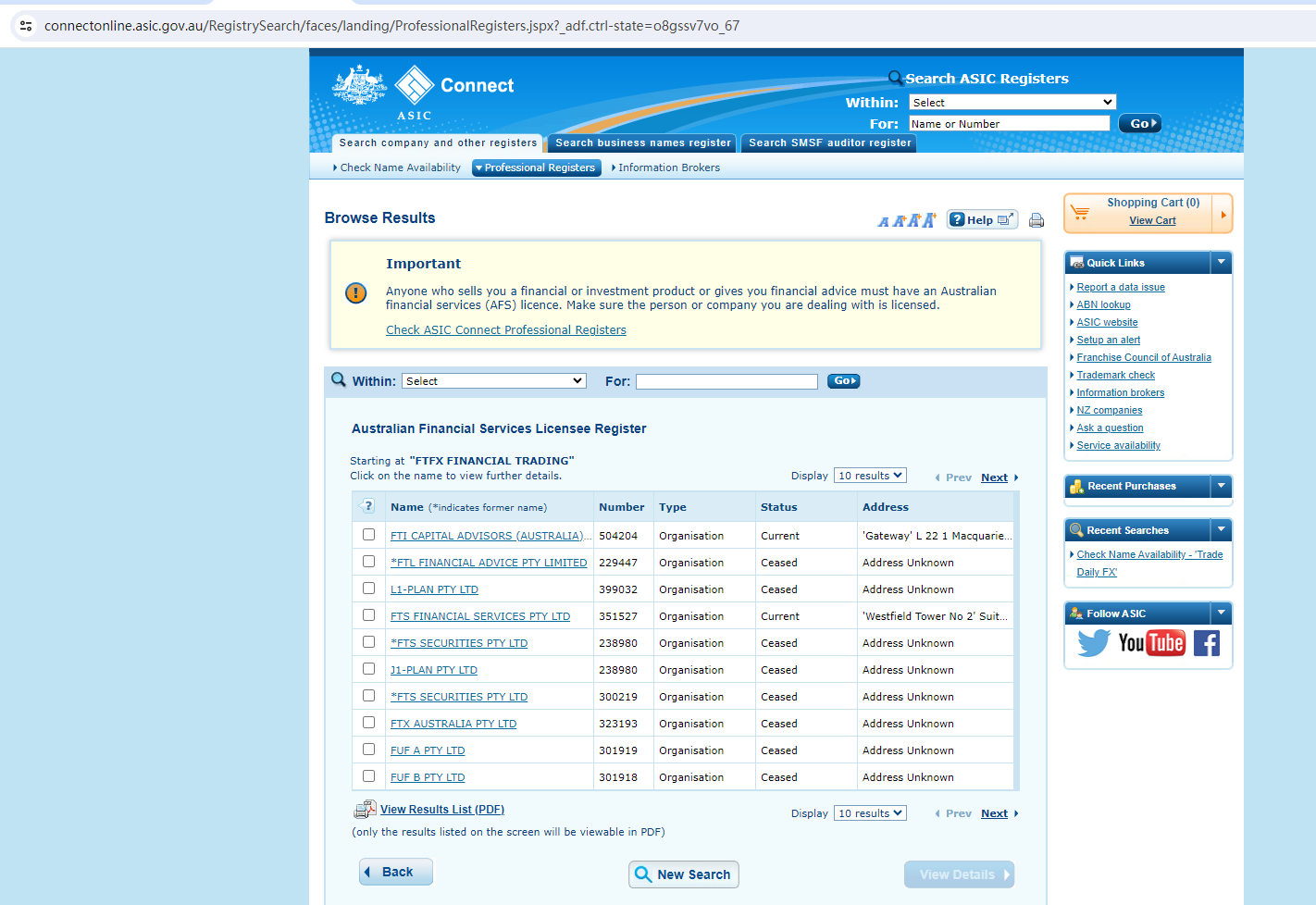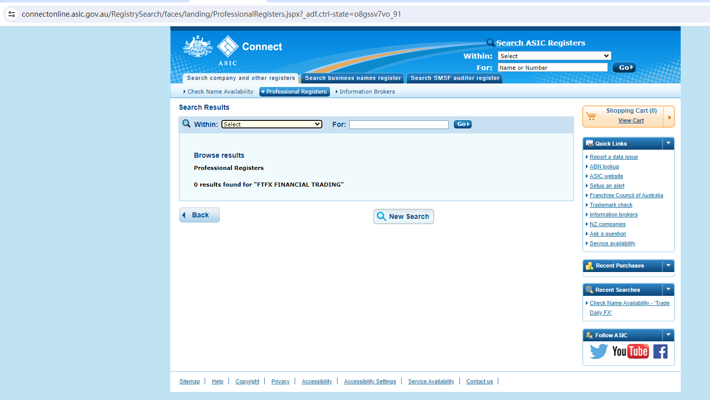 FTFX Financial Trading claims to be regulated by the Australian Securities & Investment Commission (ASIC), we searched the ASIC but found no matching results.