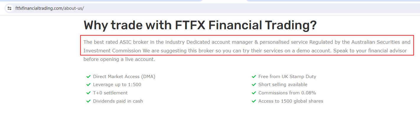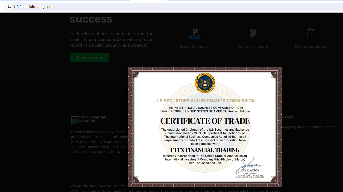 FTFX Financial Trading claims to be regulated by the Australian Securities & Investment Commission (ASIC), we searched the ASIC but found no matching results.FTFX Financial Trading claims to be regulated by the U.S. Securities and Exchange Commission (SEC), we searched the SEC but found no matching results.FTFX Financial Trading claims to be registered in the UK, but the United Kingdom Financial Conduct Authority (UK FCA) issued a warning that FTFX Financial Trading was providing finacial services or products without authorisation.The truth is that FTFX Financial Trading is not regulated by any regulators. Letting it hold or control investors' money is unsafe, and the money can not be protected by any laws.FTFX Financial Trading is a scam.