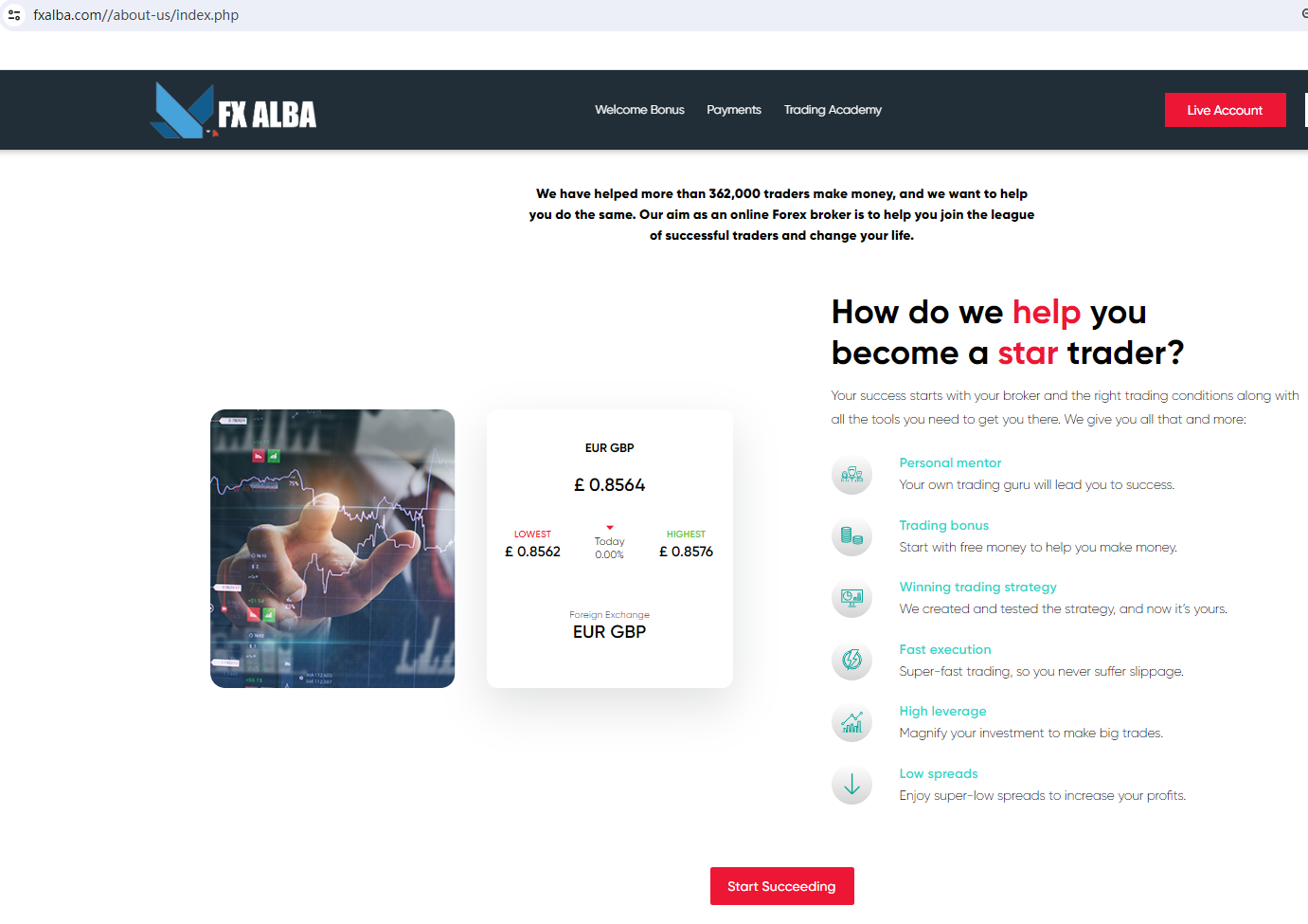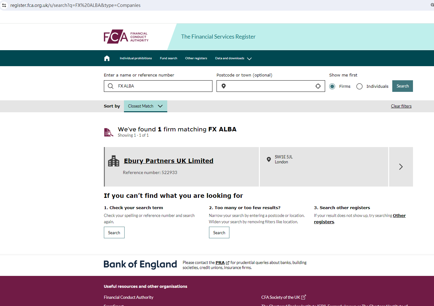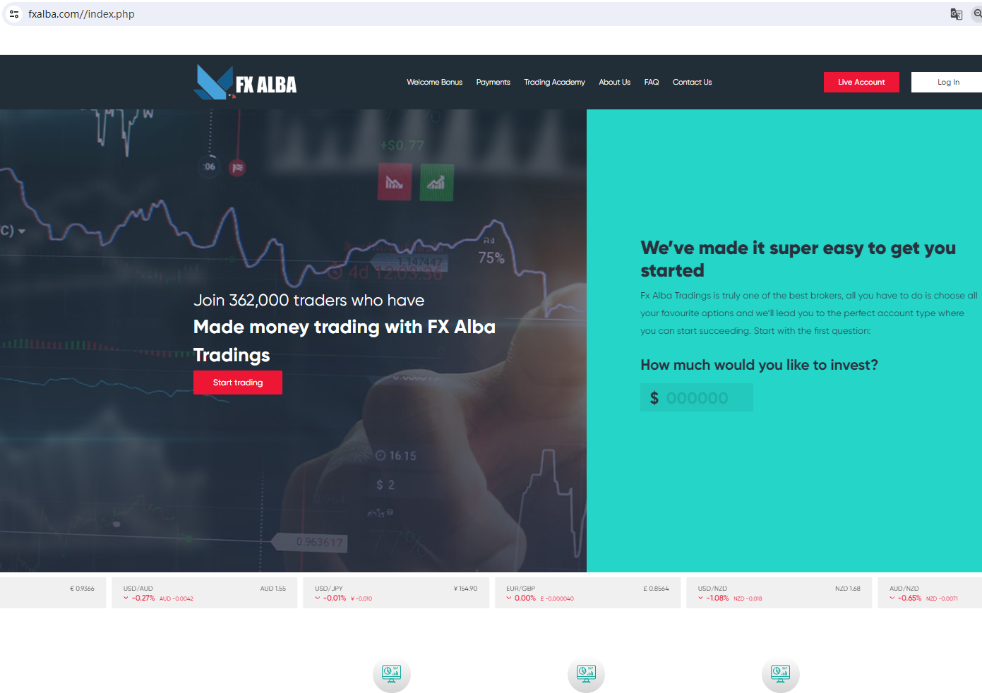 According to its website, it is located in the UK. Upon investigation, no matching information was found in the Financial Conduct Authority (FCA).In essence, FX ALBA is not regulated by any governing body. Entrusting it with investors' funds is highly risky, as there are no legal protections in place to safeguard the funds.FX ALBA appears to be a scam.